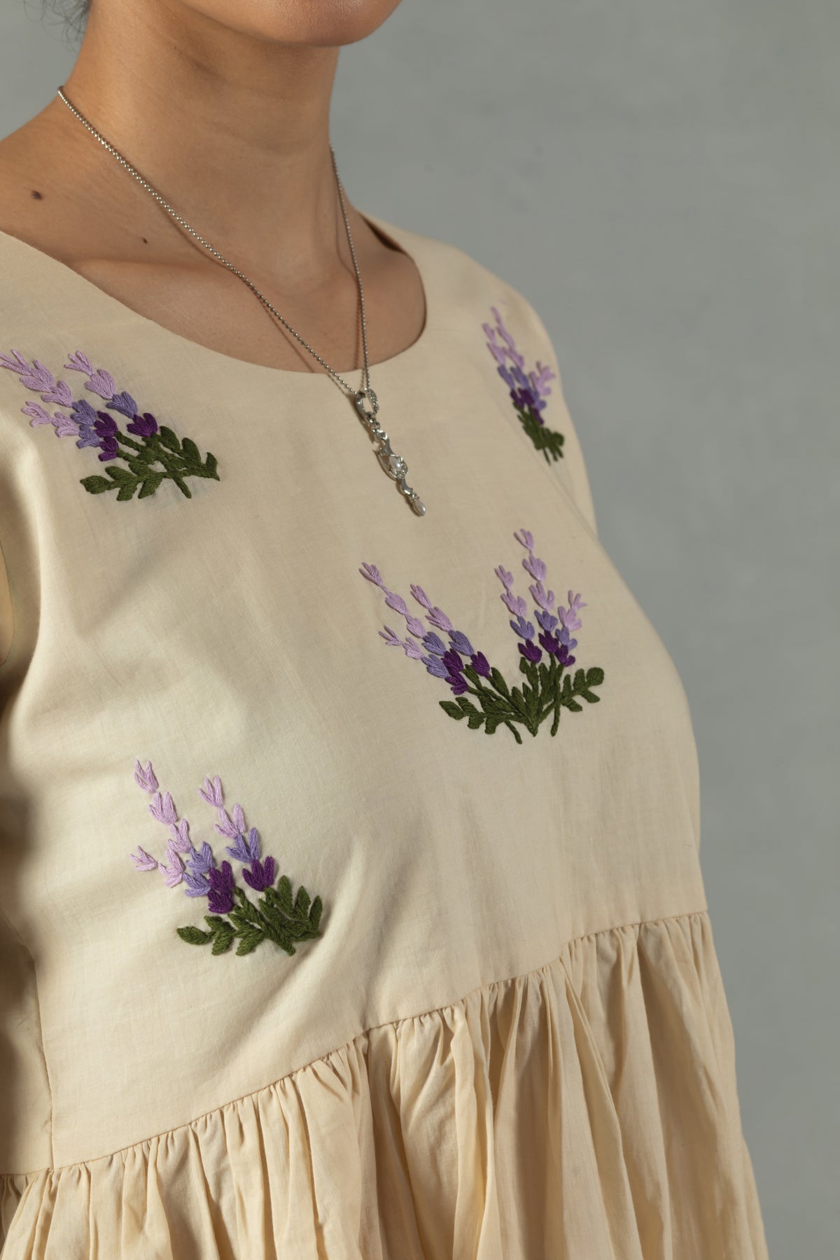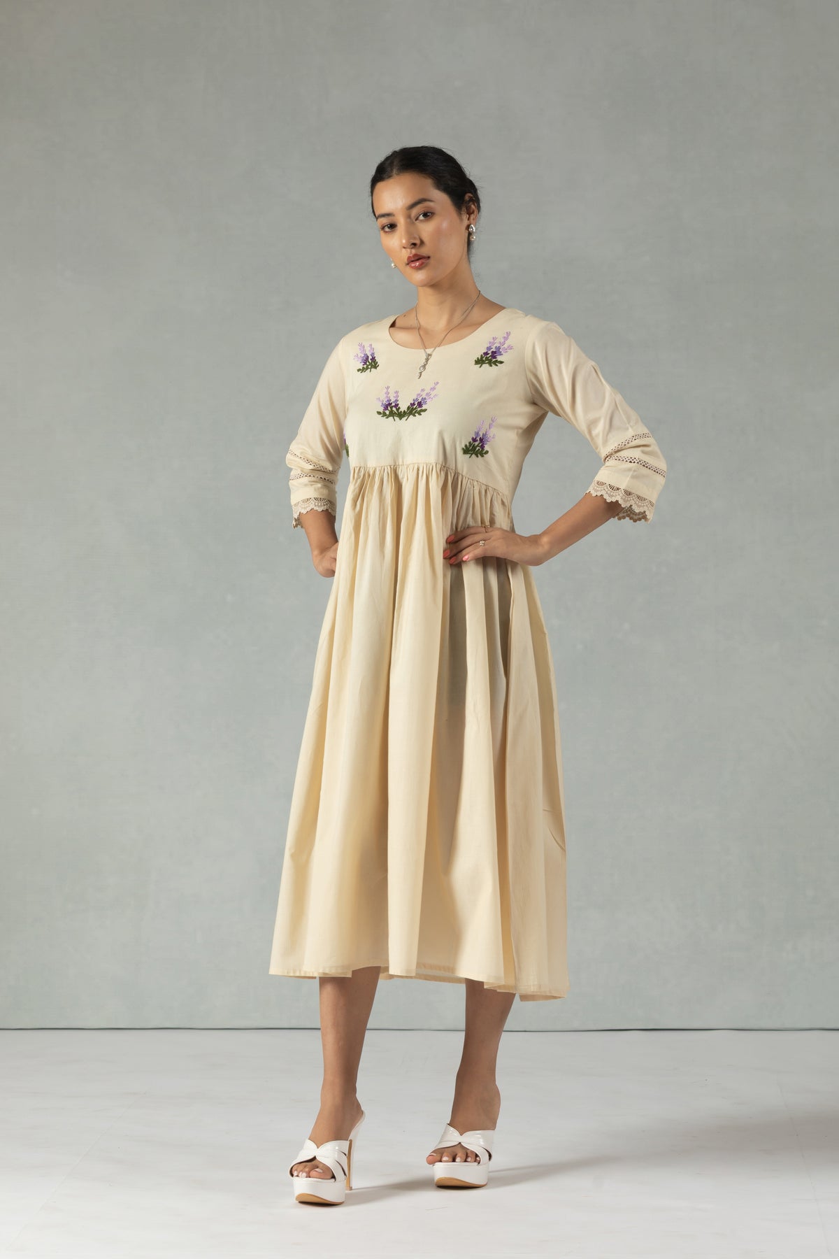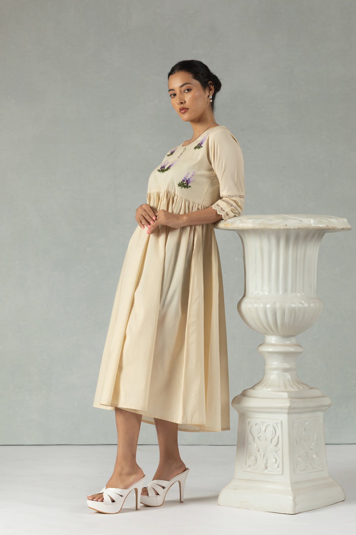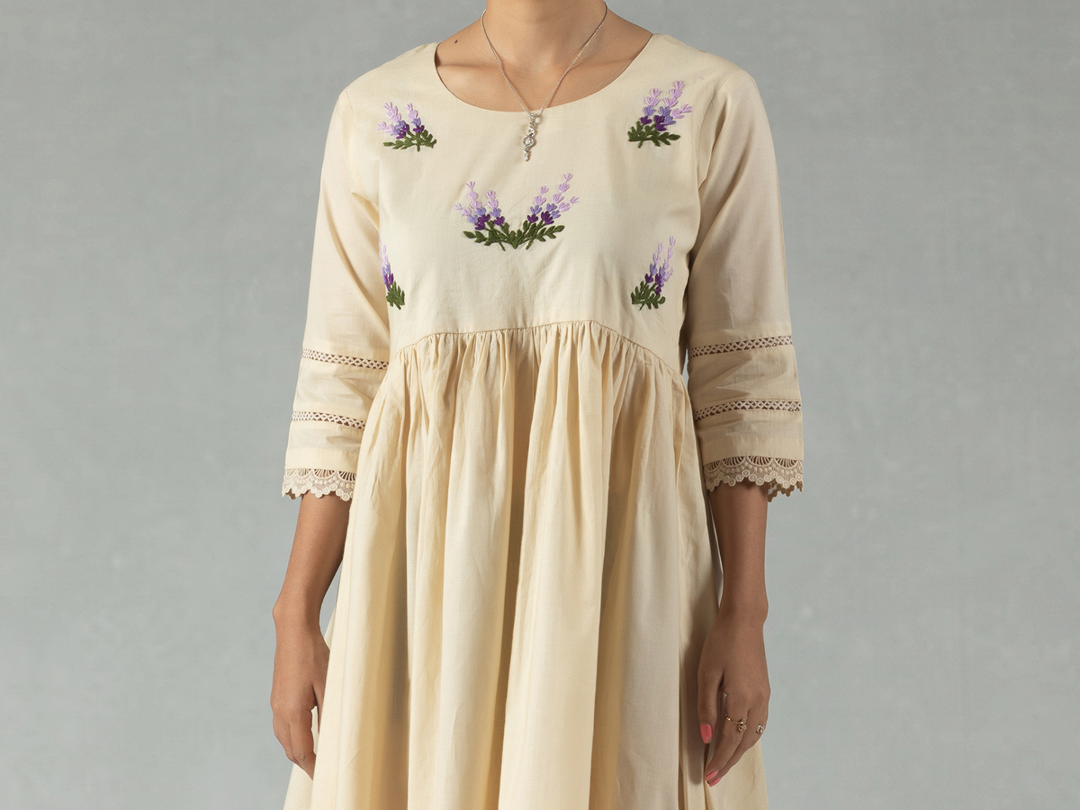 This ivory-toned dress features delicate floral hand embroidery that brings soft elegance to your daily wardrobe. The round neckline and quarter sleeves offer effortless comfort, while breathable 100% pure cotton keeps you cool throughout. Hand wash gently for embroidery care.