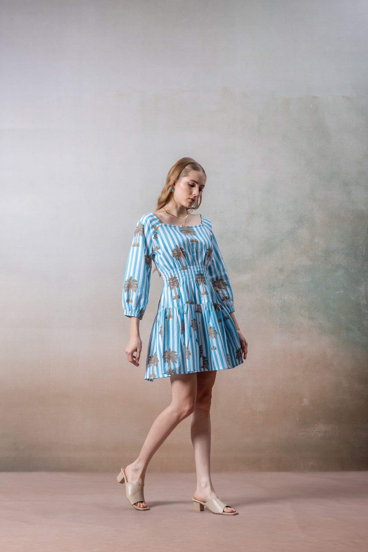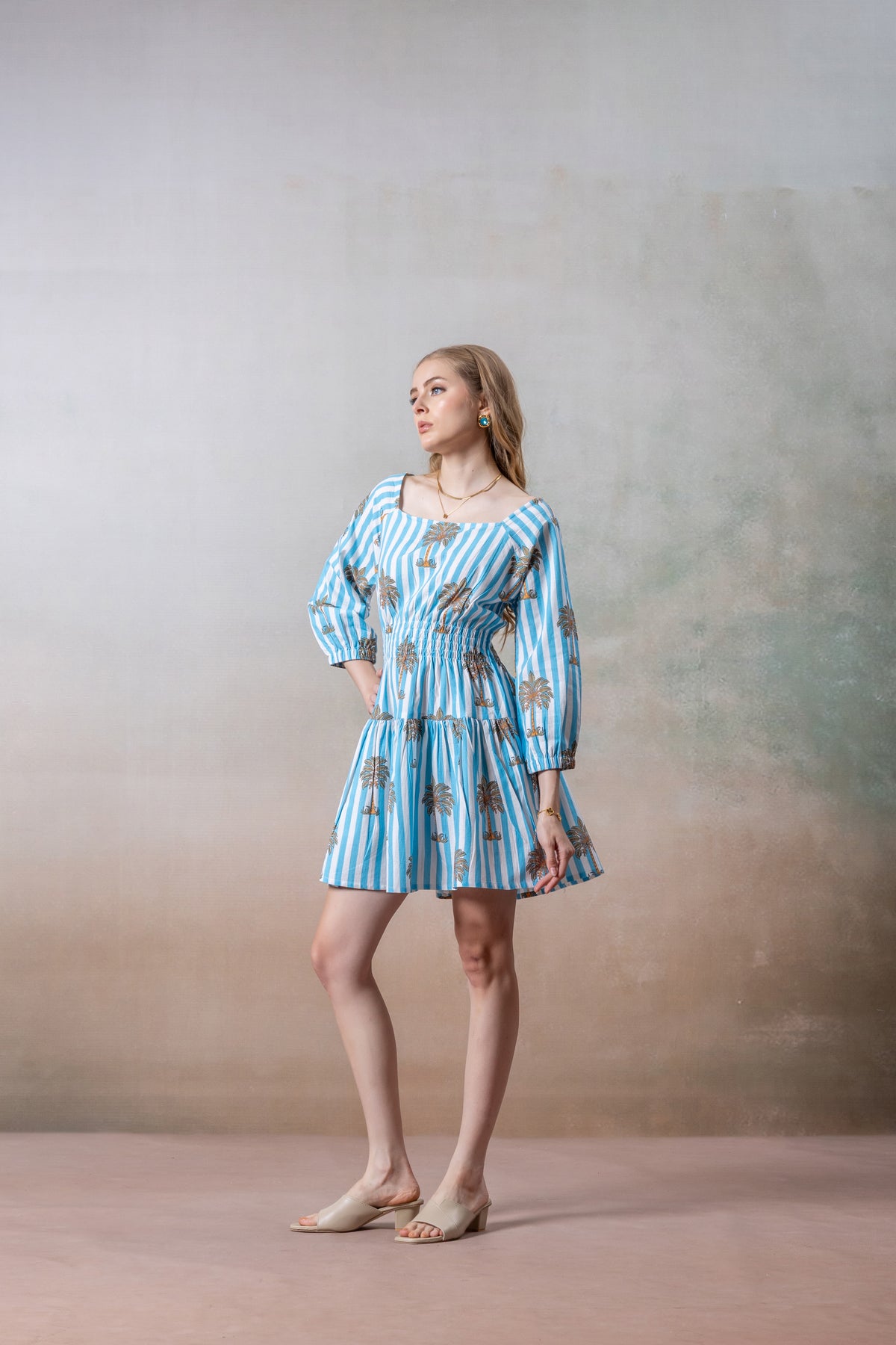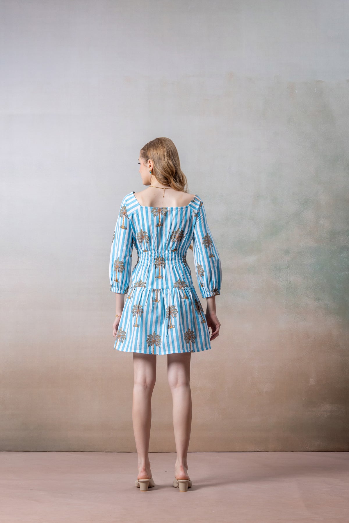 Azure Palm Striped Cotton Short Dress