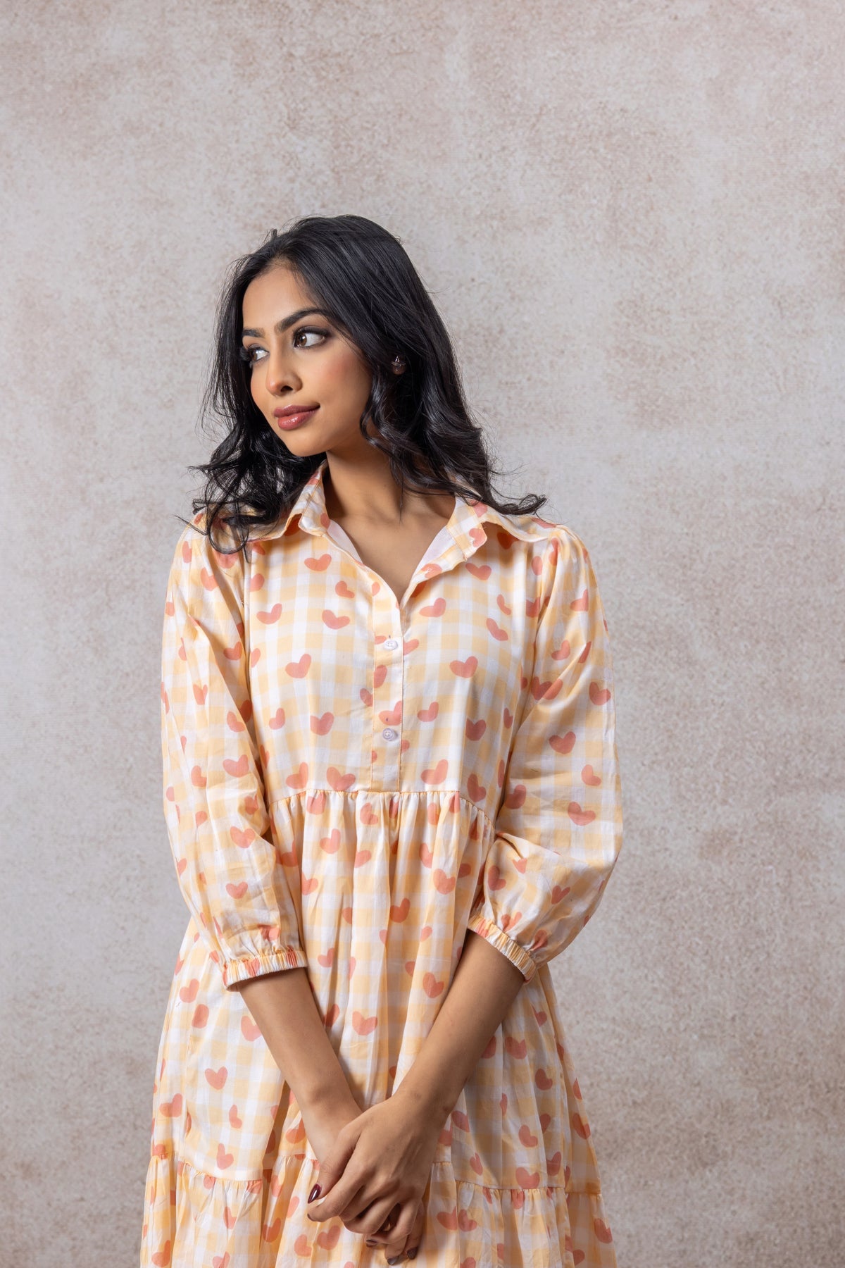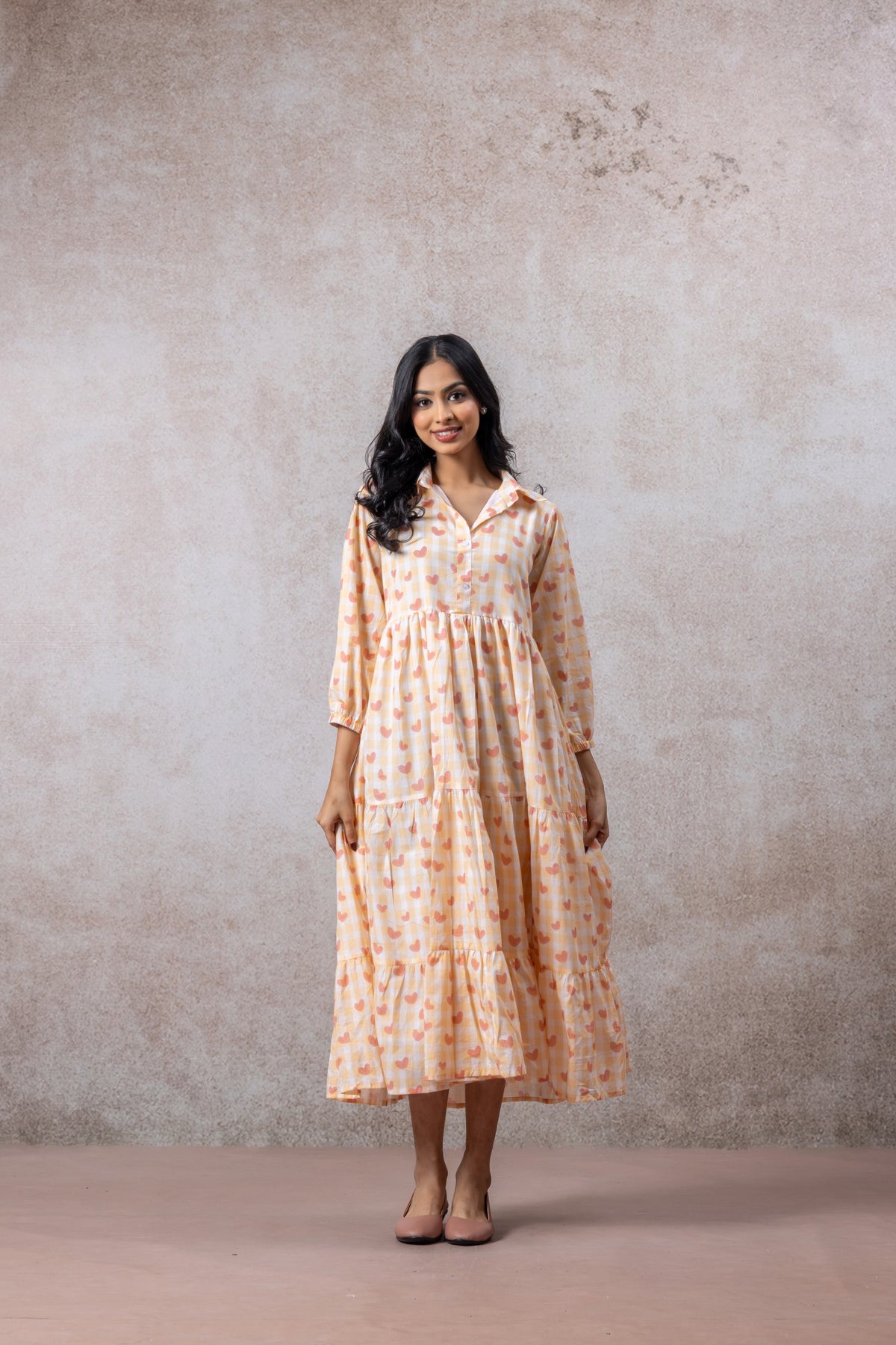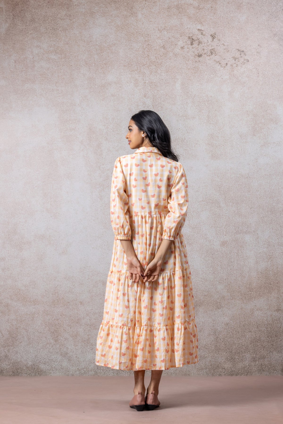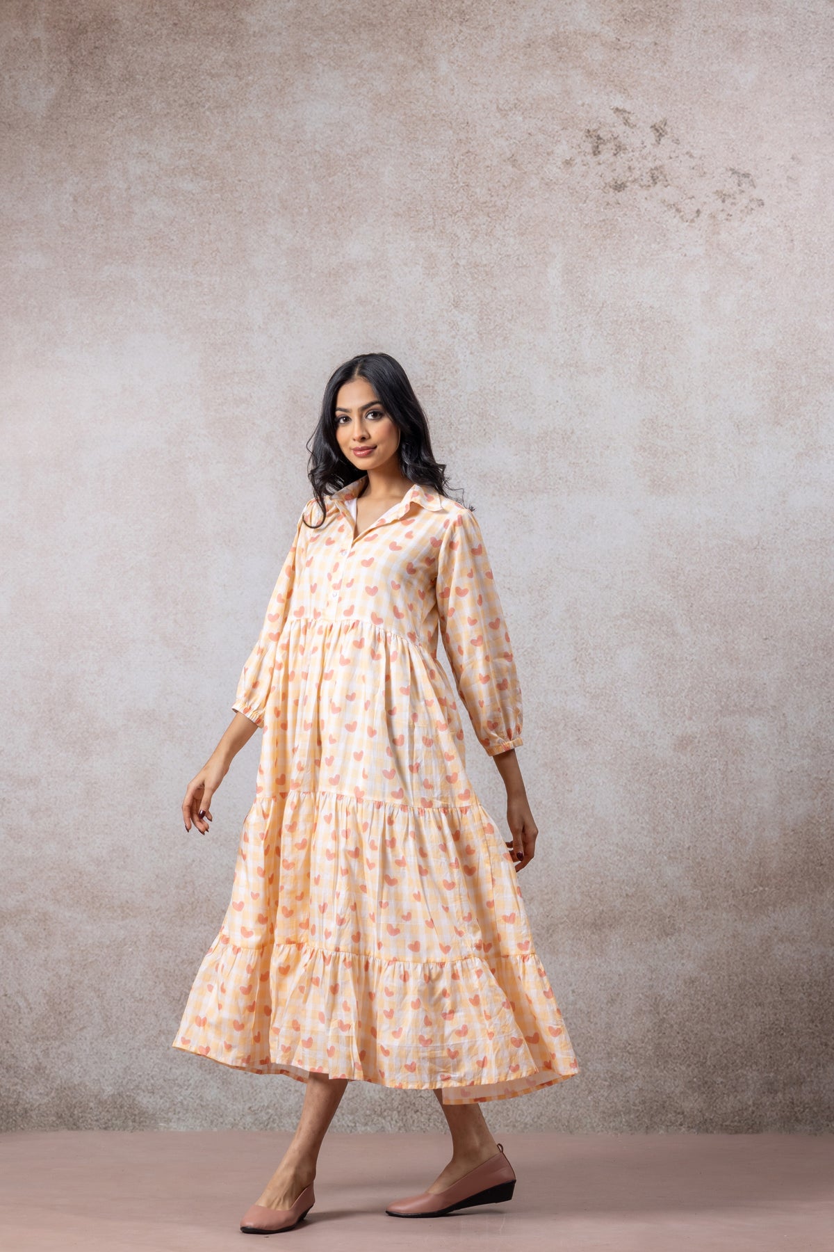 The tiered silhouette adds graceful movement, while the collared neckline and three-quarter sleeves give it a refined touch perfect for brunches, festive gatherings, or casual outings.