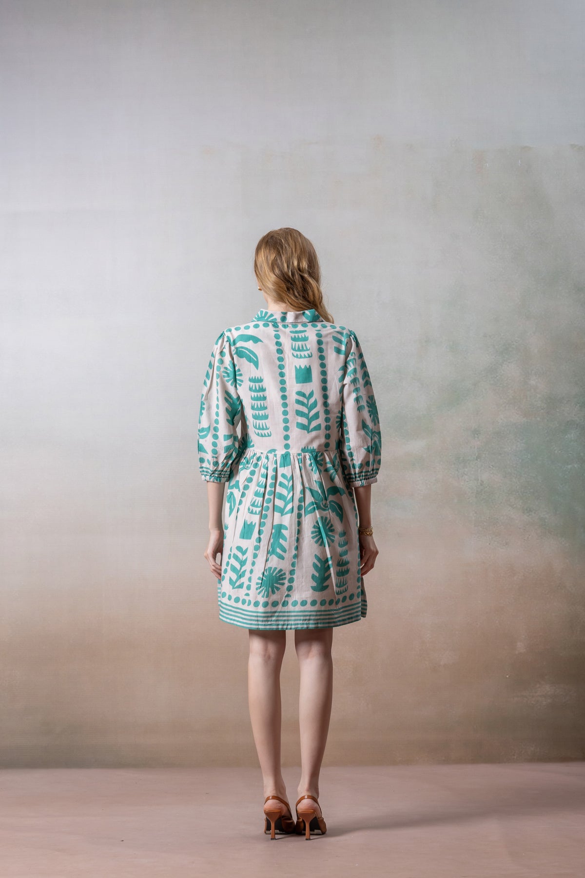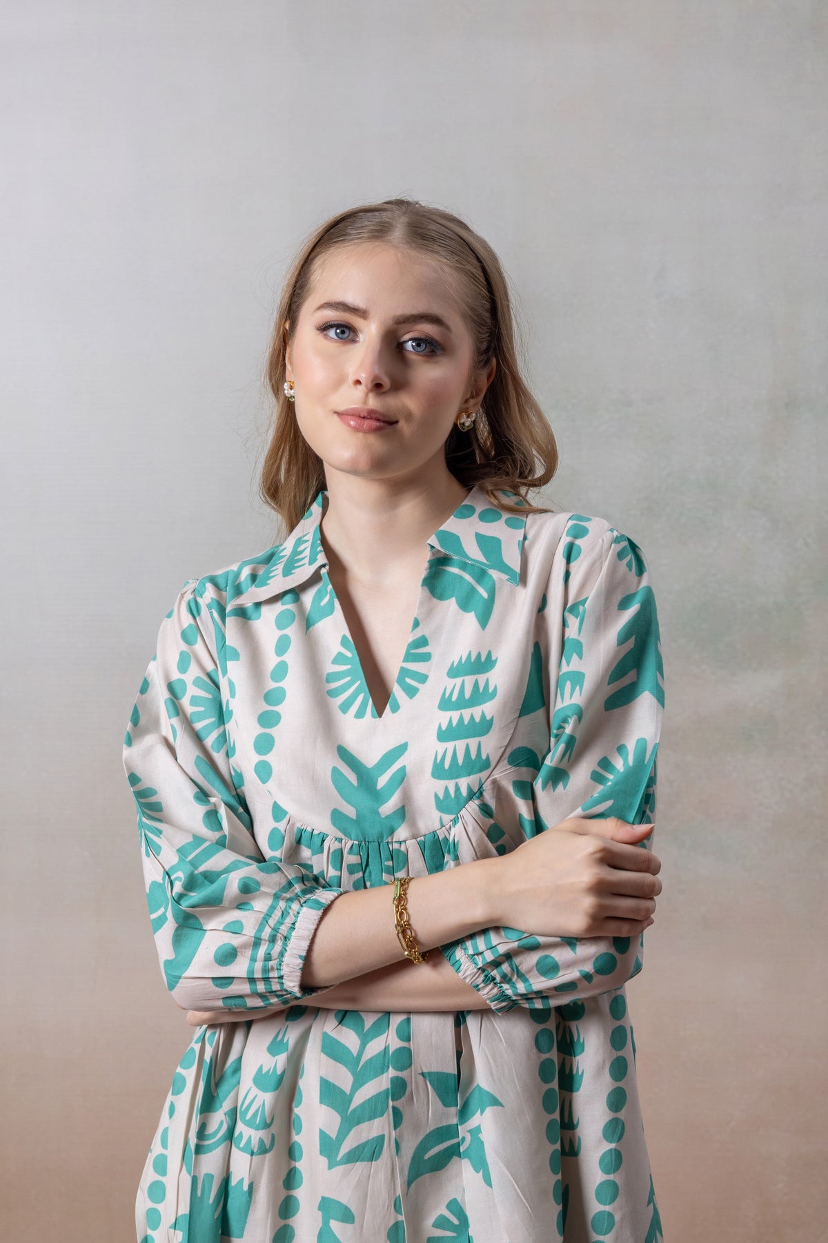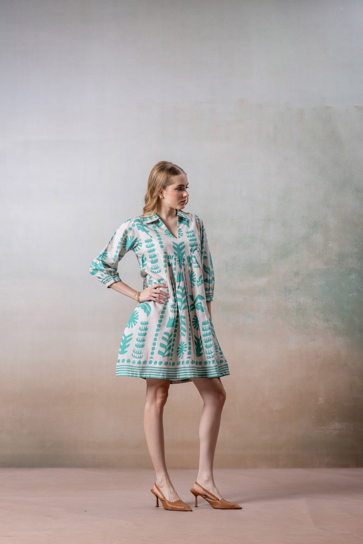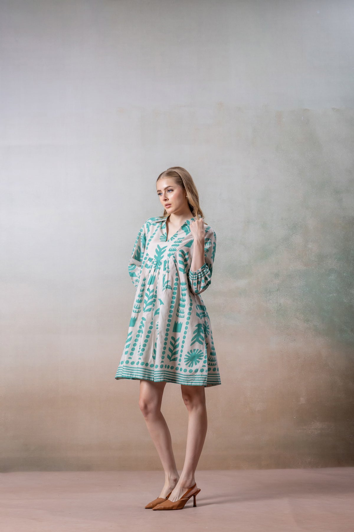 Breeze through the day in style with our Mint Meadow Printed Cotton Short Dress, a perfect blend of comfort and charm. This easy-fit dress is crafted from lightweight premium cotton, featuring a soft beige base with refreshing mint-green botanical prints inspired by nature’s calm hues.