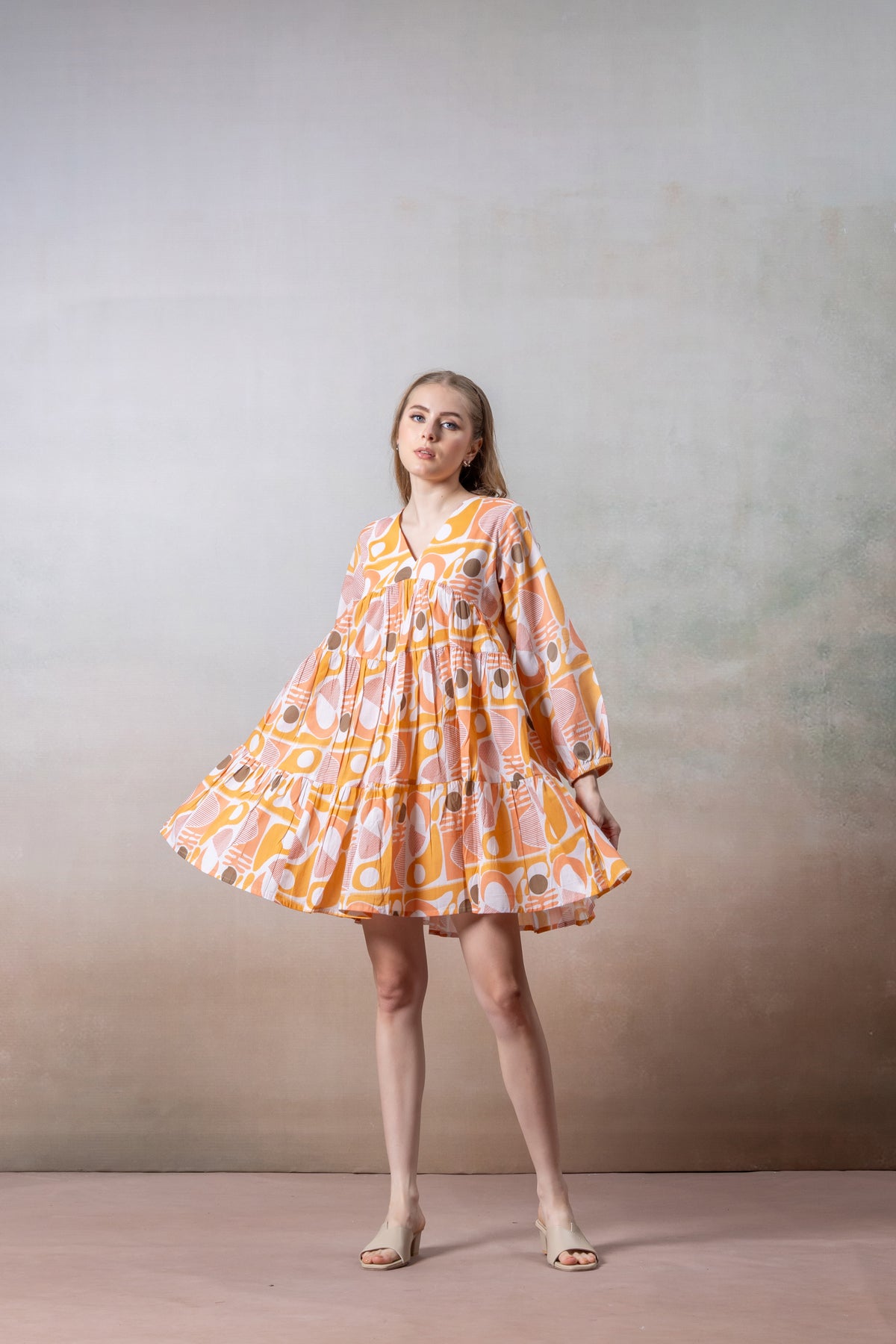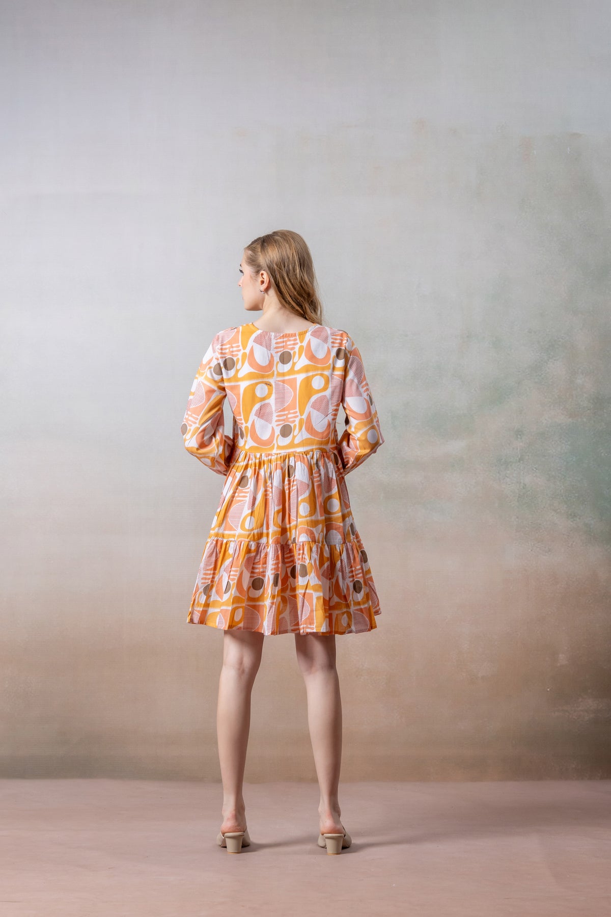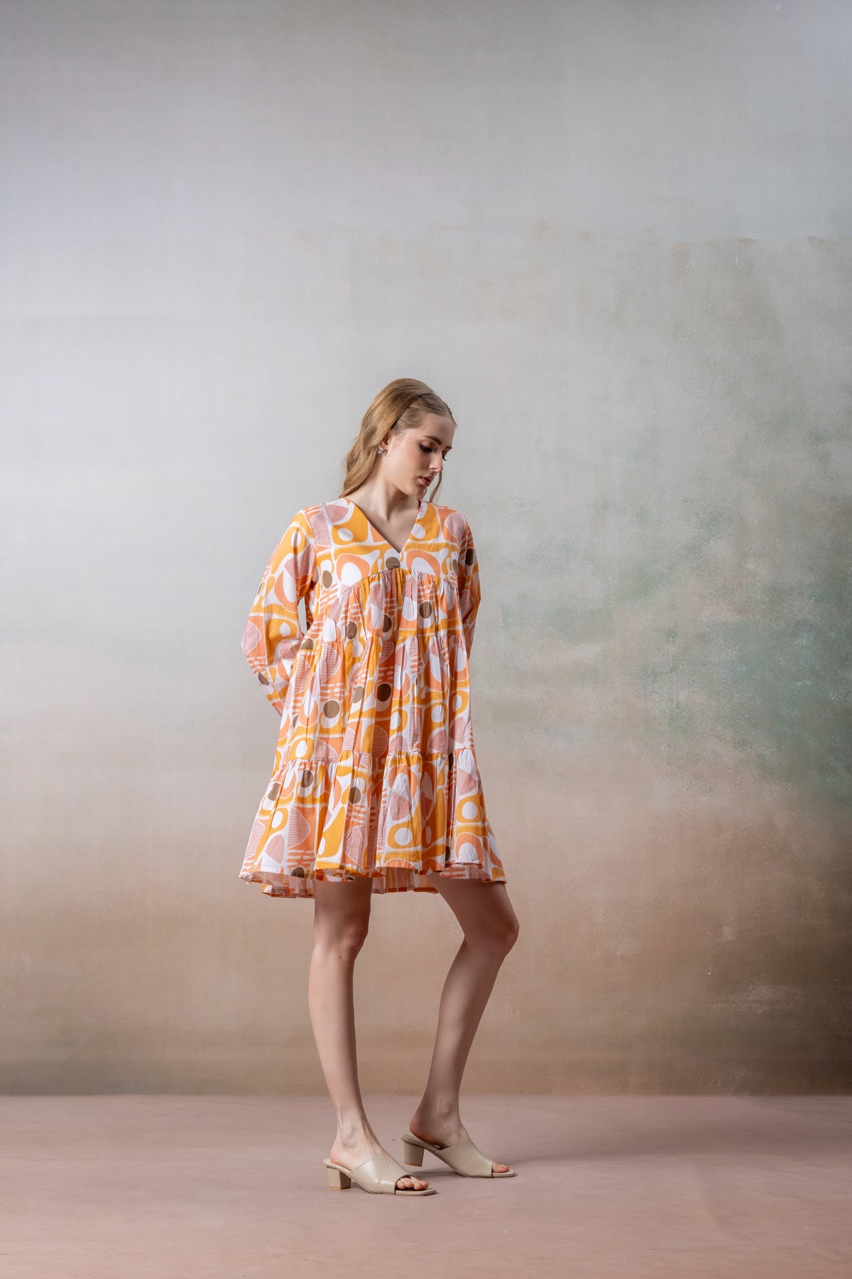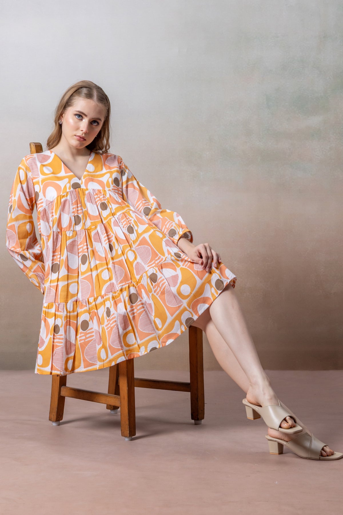 Radiate effortless charm with our Sunset Aura Geometric Printed Tiered Dress, a perfect blend of comfort and modern elegance. Crafted from lightweight, breathable fabric, this dress features a vibrant mix of orange, peach, and white geometric prints that capture the warmth of summer sunsets. The V-neckline, tiered silhouette, and long sleeves offer a relaxed yet flattering fit that moves beautifully with every step.