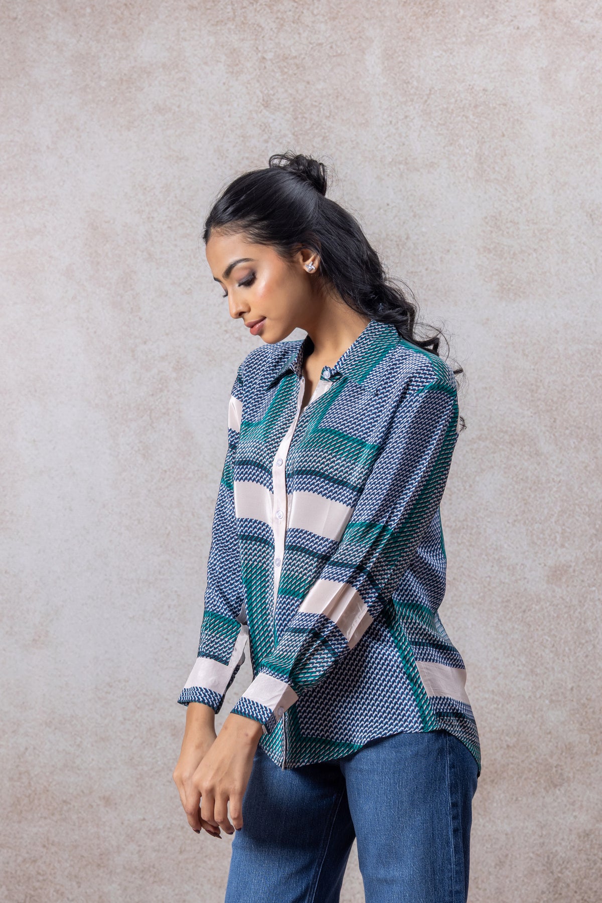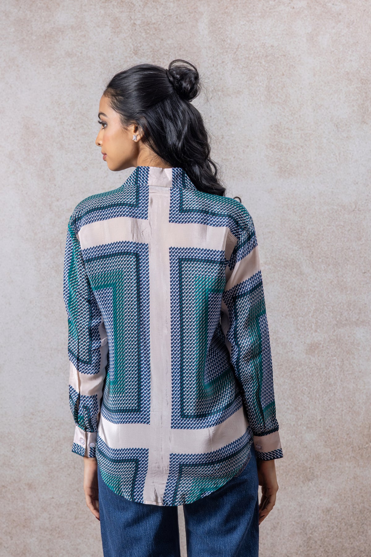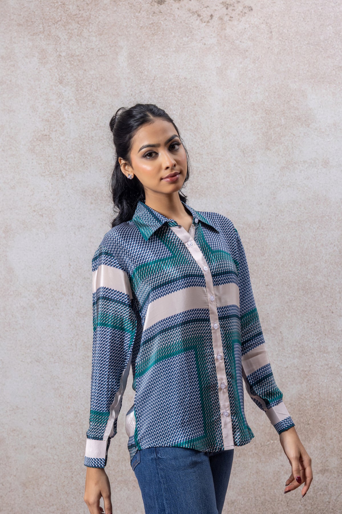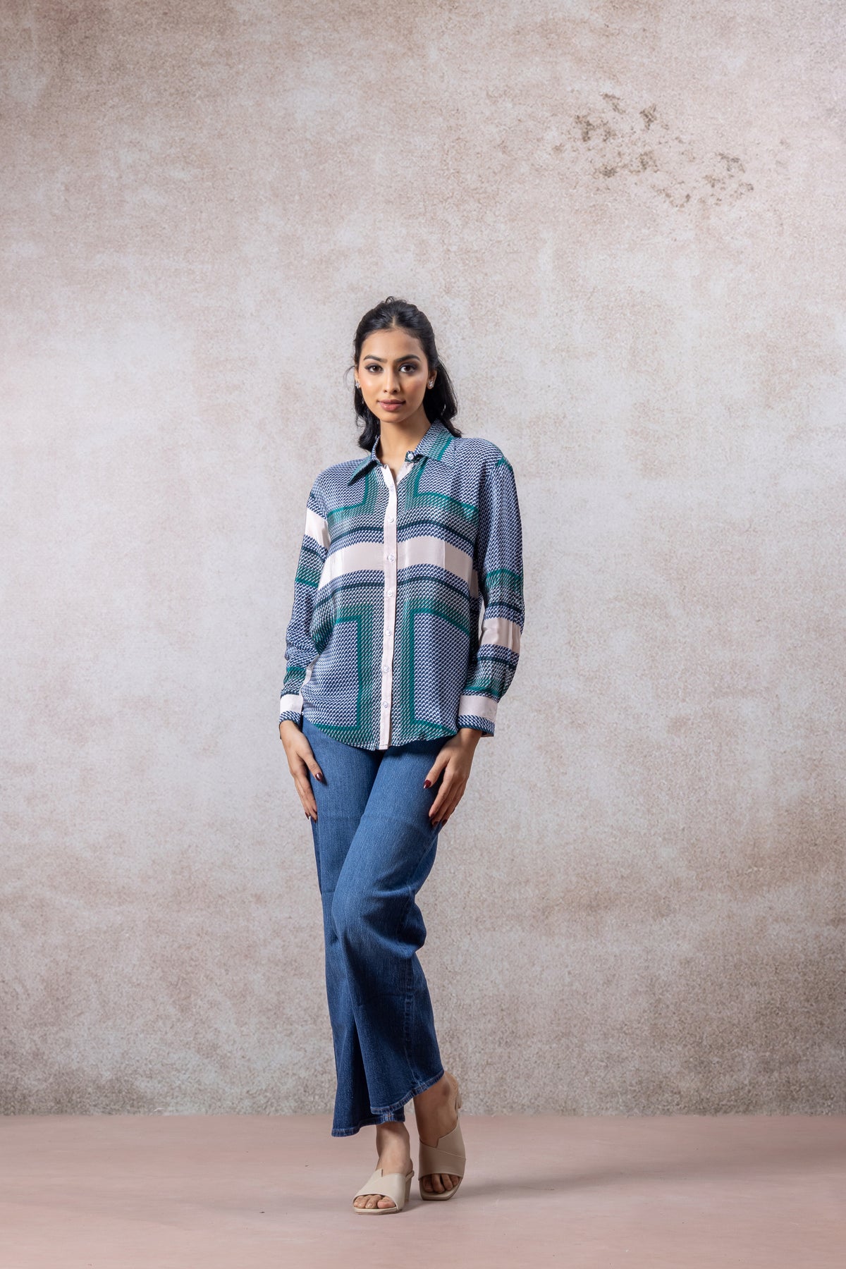 Effortless style meets everyday comfort in our Women’s Geometric Print Cotton Shirt. Crafted from breathable, lightweight cotton, this button-down shirt features a modern geometric pattern in calming shades of blue and green. The relaxed fit and full sleeves make it perfect for casual outings, workwear, or weekend brunches.
