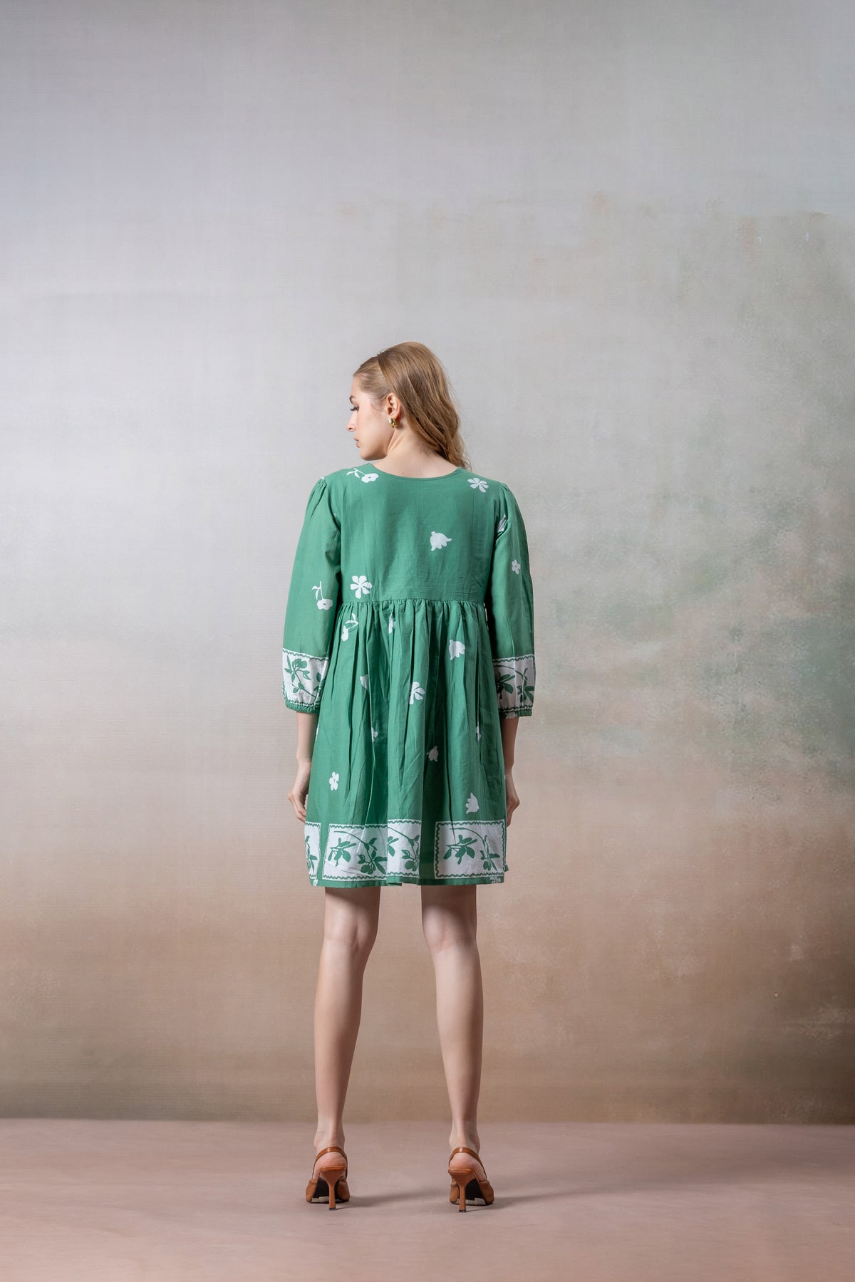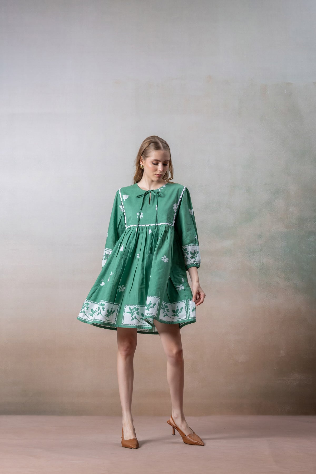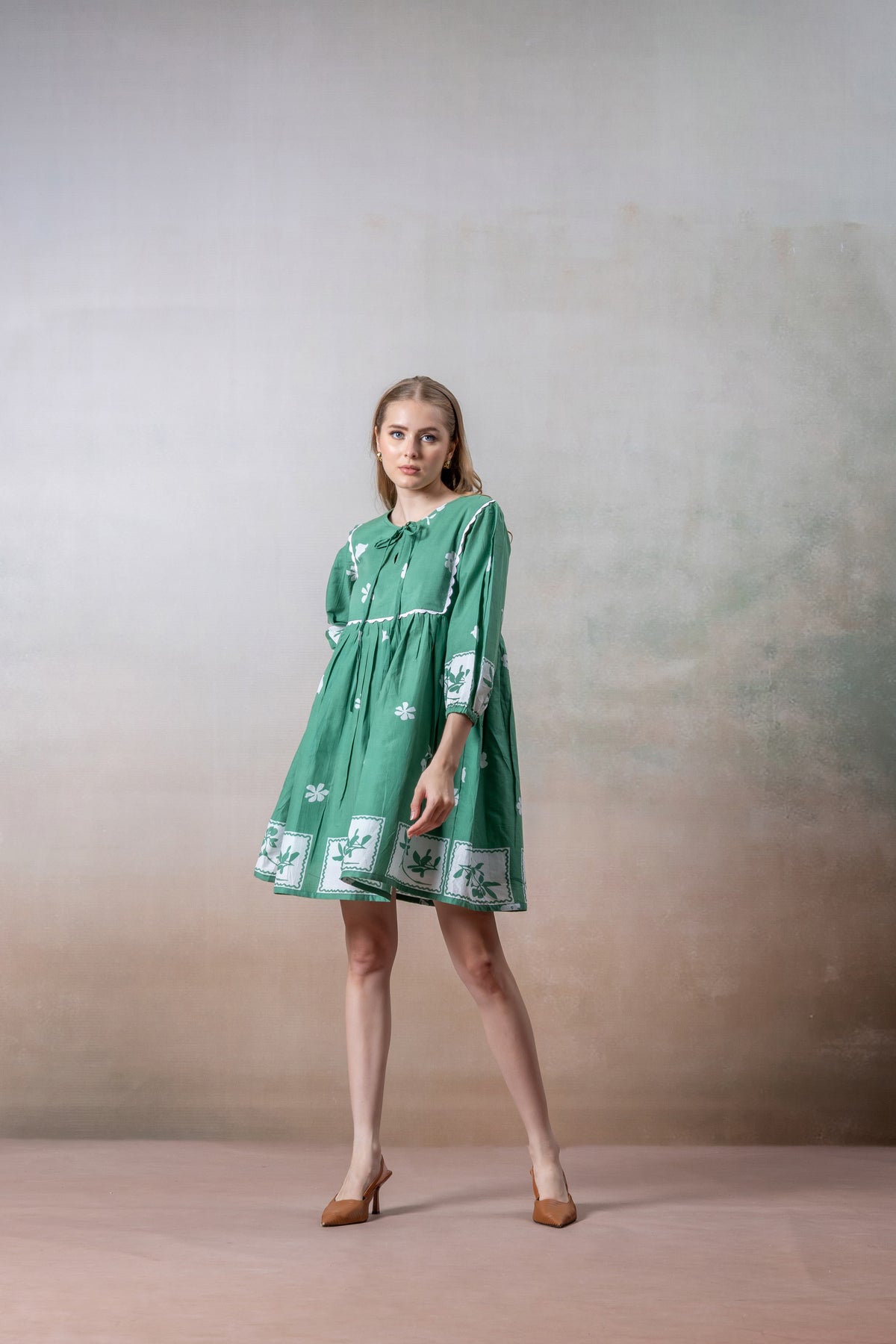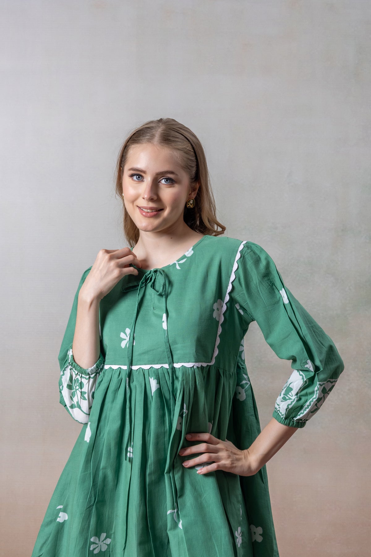 Channel timeless elegance with our Meadow Charm Green Digital Print Short Dress, a refreshing blend of handcrafted detailing and effortless silhouette. Designed in a soothing forest green hue, this dress features white digital print and border motifs that exude artisanal charm. The tie-up neckline, long sleeves, and gathered waist create a flattering, feminine shape perfect for both casual and semi-dressy occasions.