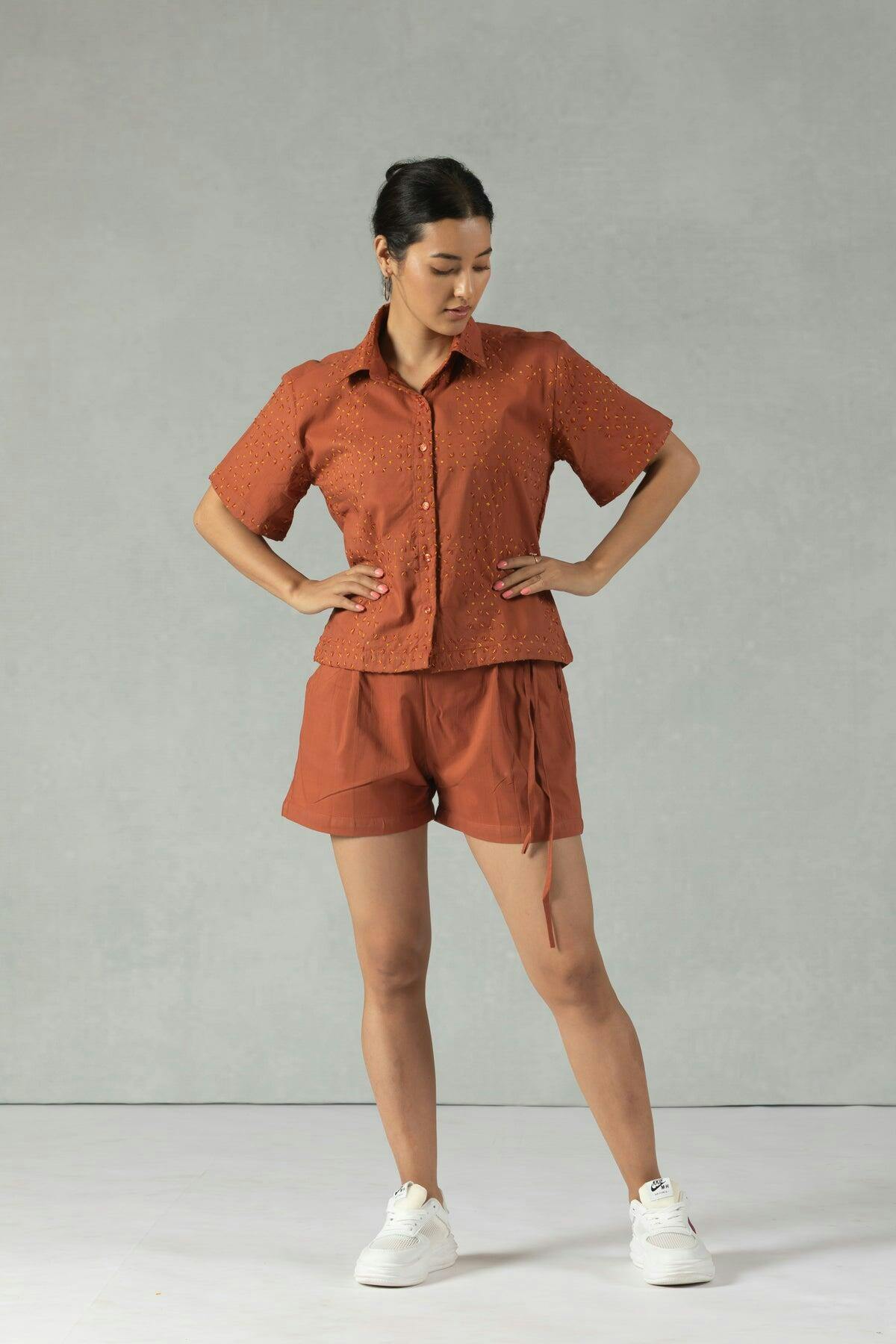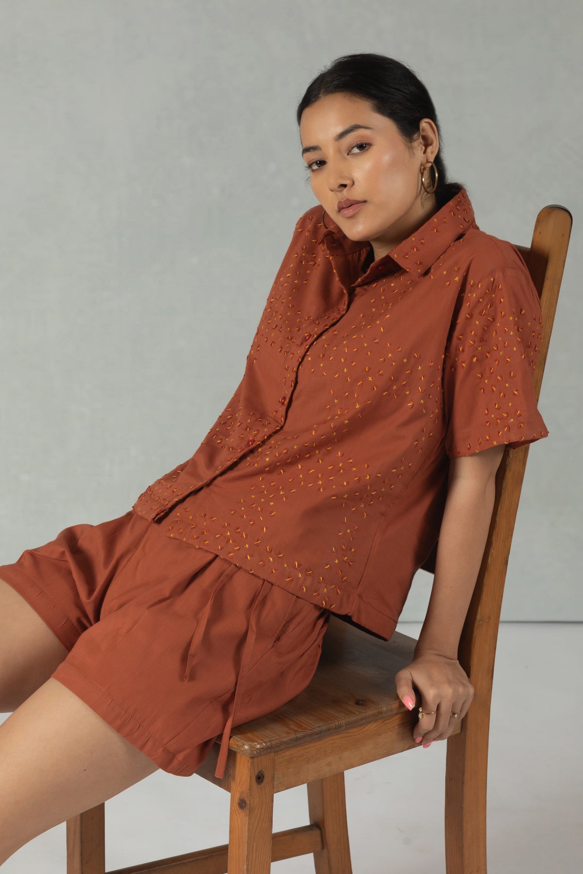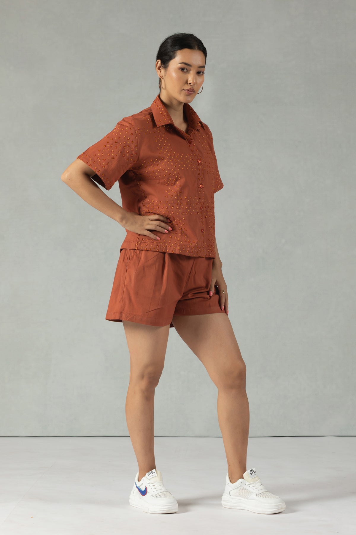 Elevate your casuals with this brown solid co-ord set in soft 100% pure cotton. The half-sleeve top and matching shorts promise easy movement and all-day comfort. Ideal for travel, lounging, or coffee dates, this fuss-free set retains its softness with simple hand washing.