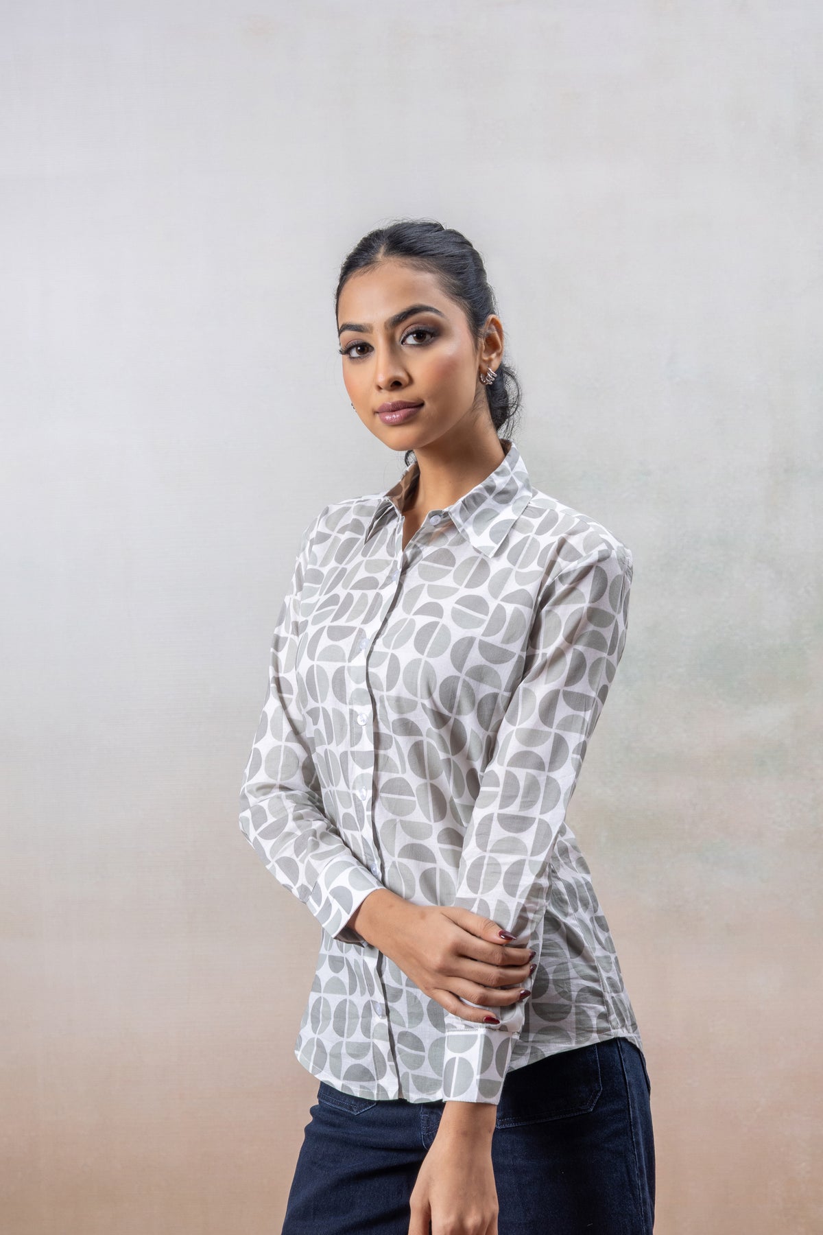 Elevate your everyday style with this Grey Geometric Print Cotton Shirt, blending modern patterns with timeless sophistication. Made from soft, breathable cotton, this shirt offers all-day comfort and a clean, structured silhouette.