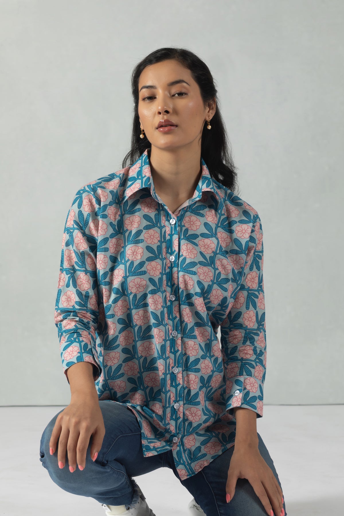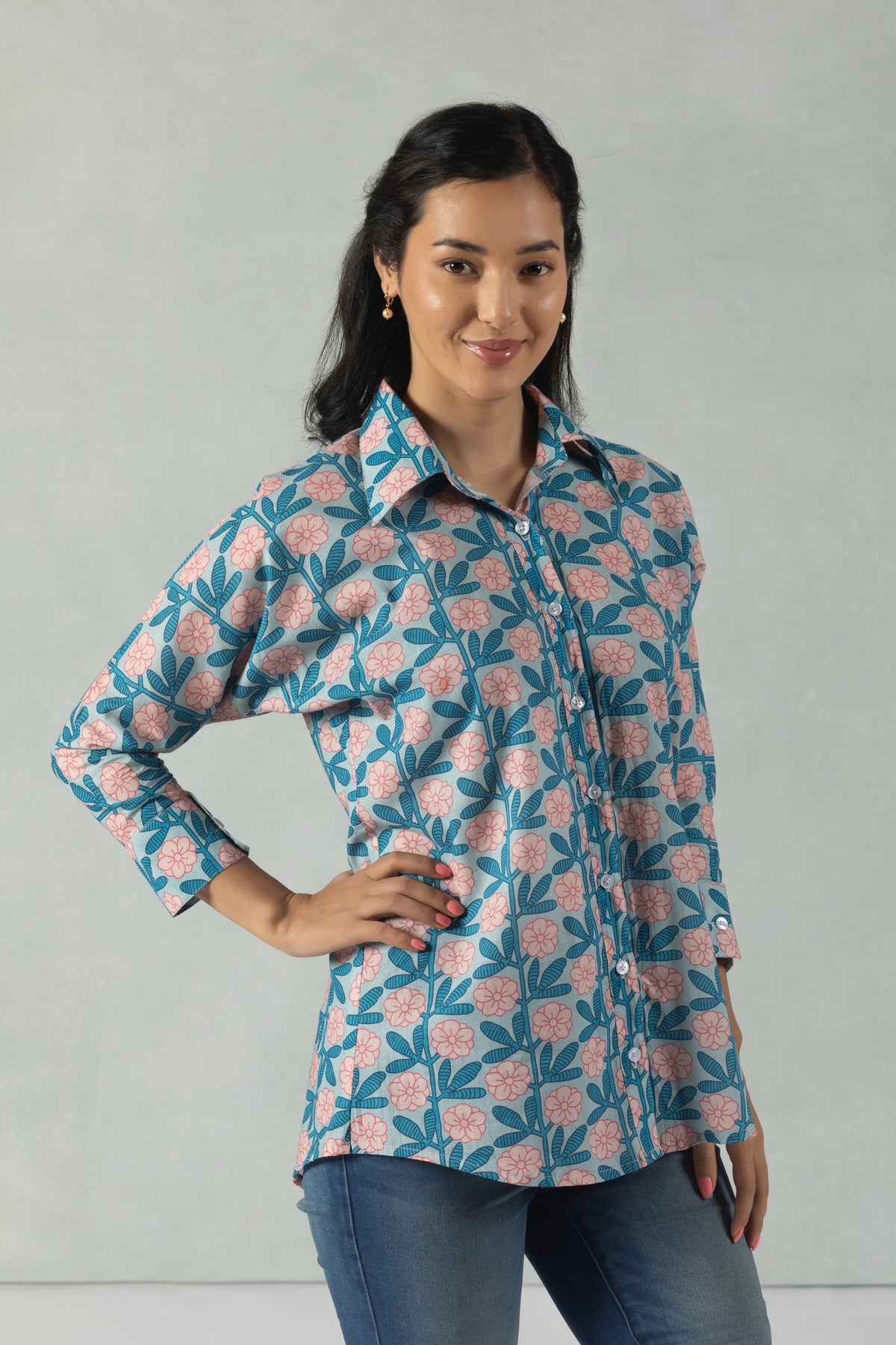 A playful abstract garden-inspired print brings life to this blue 100% pure cotton shirt. The quarter sleeves and breathable fabric make it an ideal pick for everyday wear. Stay cool, comfortable, and effortlessly stylish through long workdays or weekend outings. Hand wash recommended for best results.