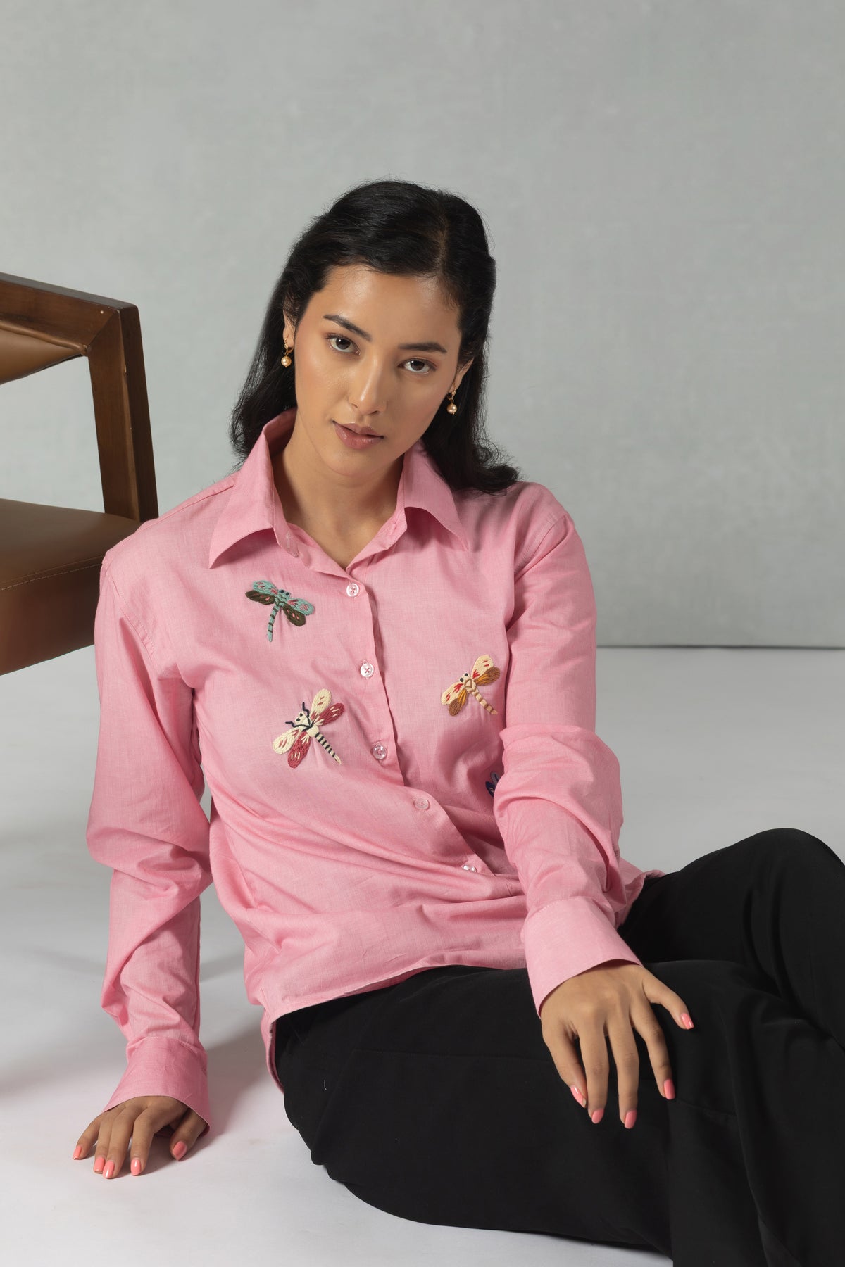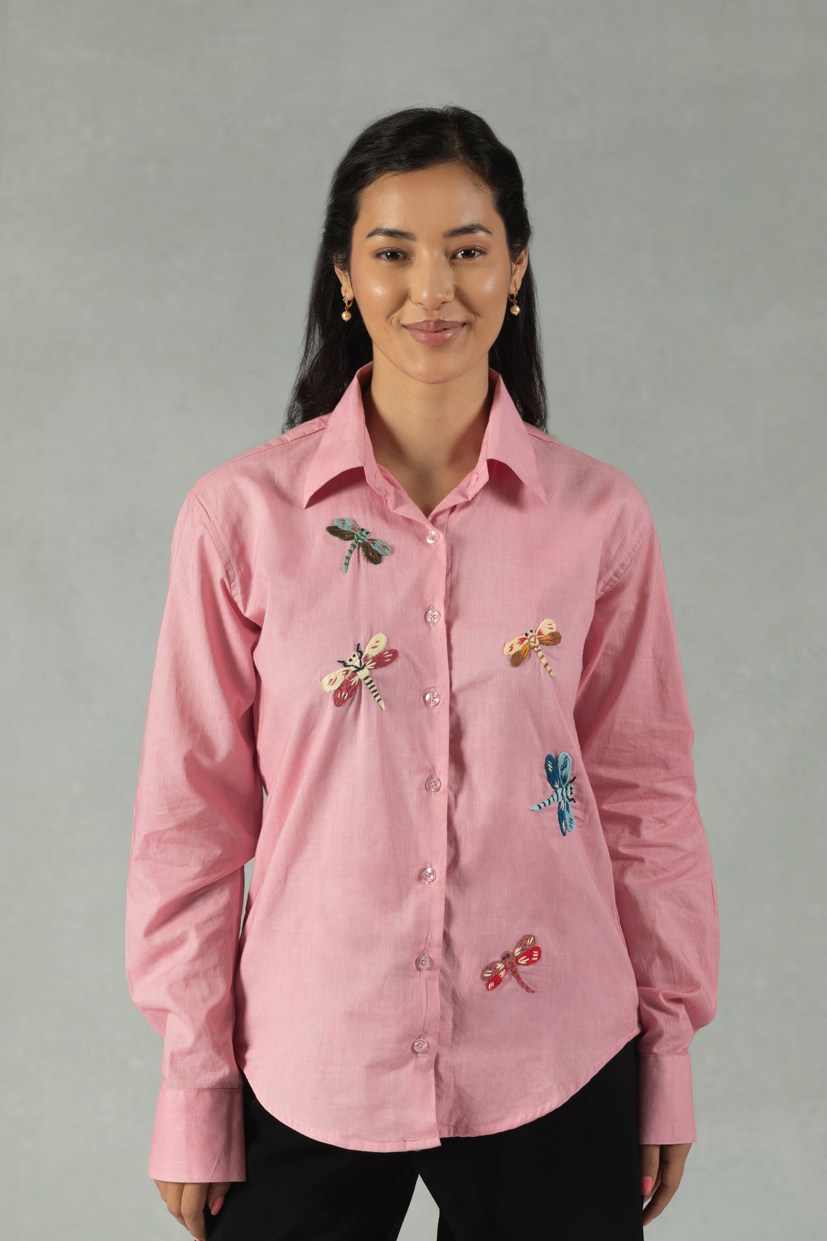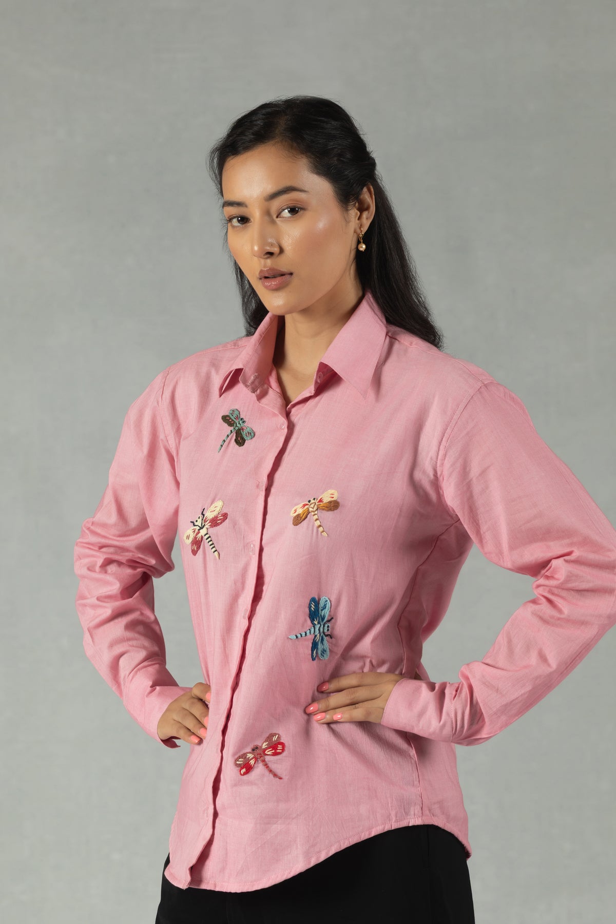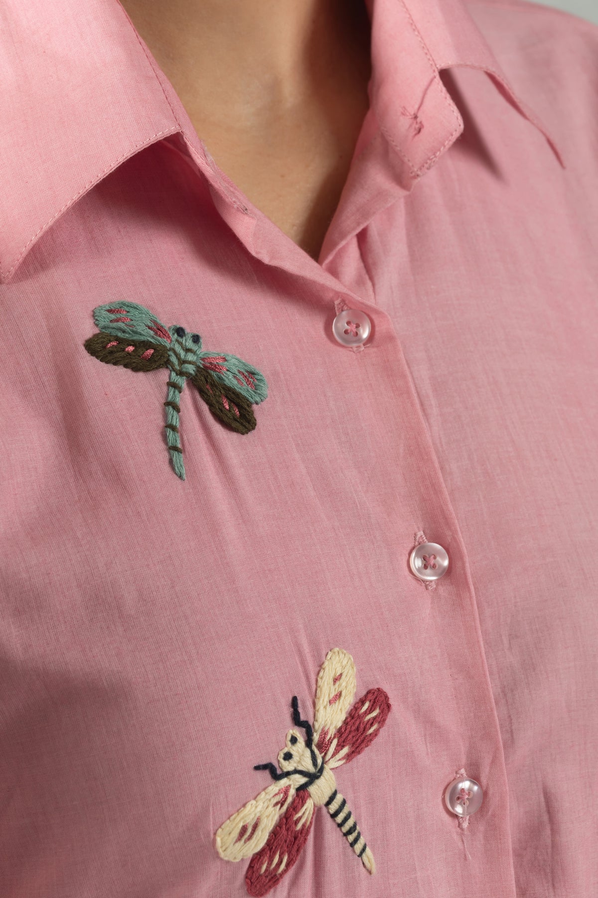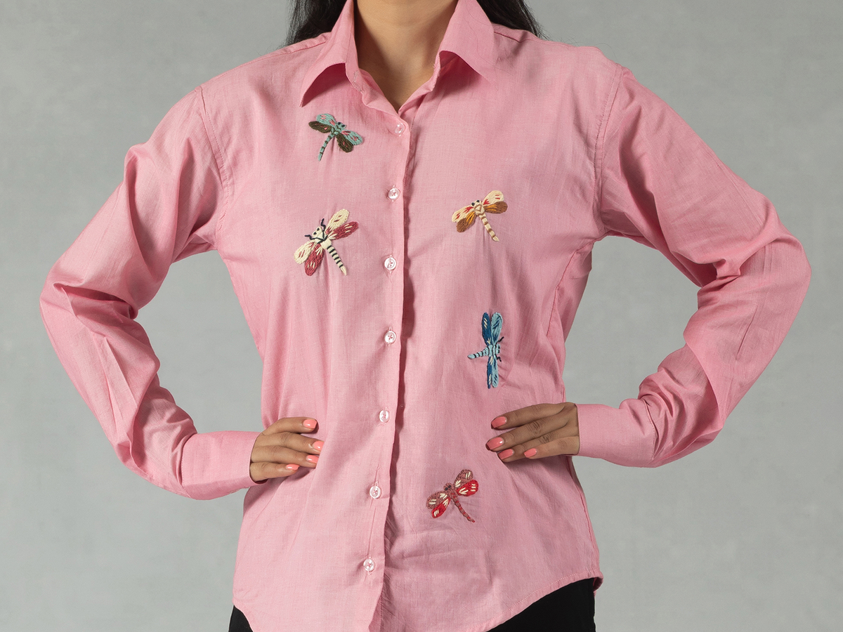 Pink Cotton Shirt with Hand Embroidered Dragonfly Motif