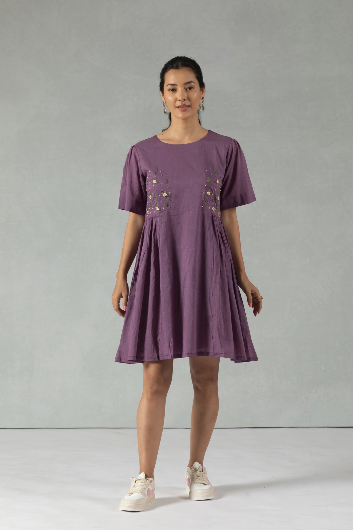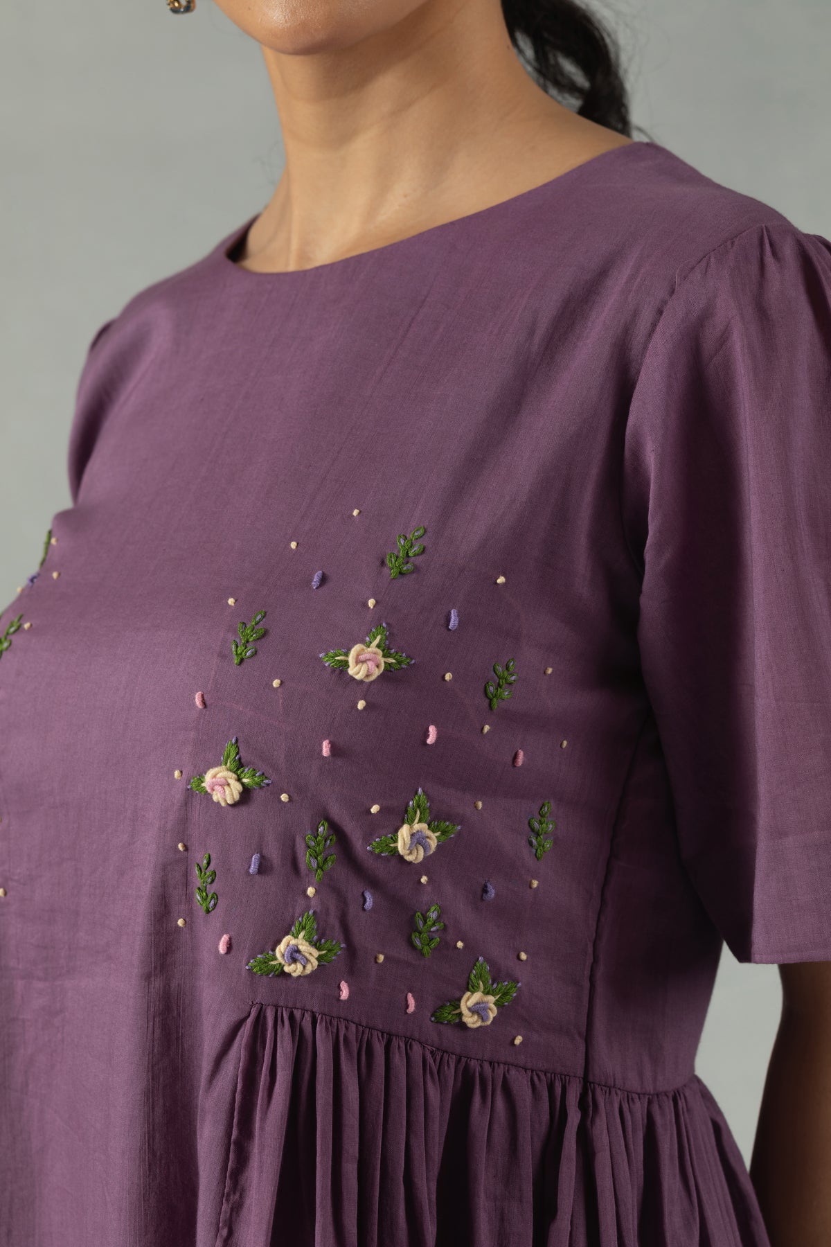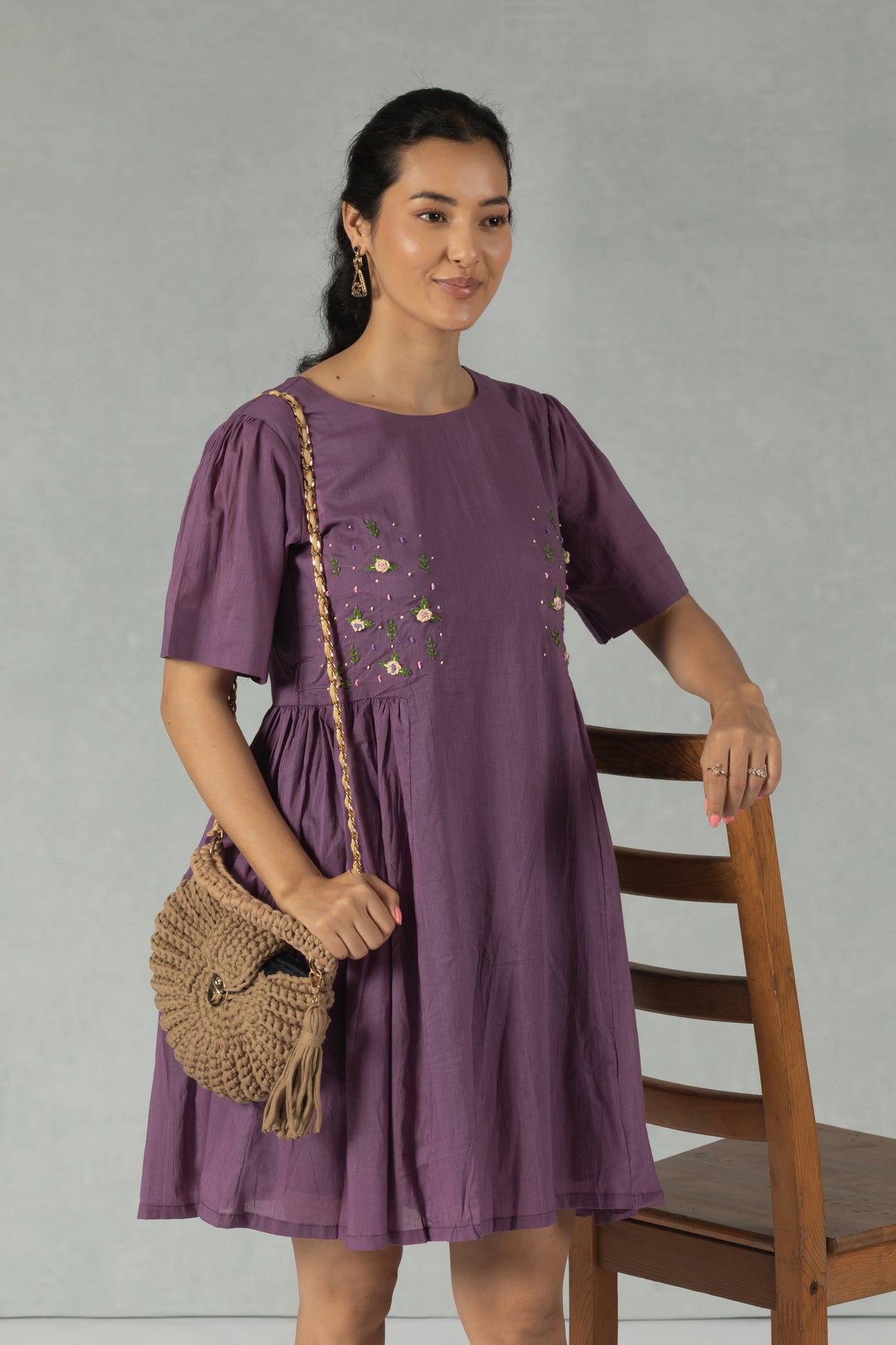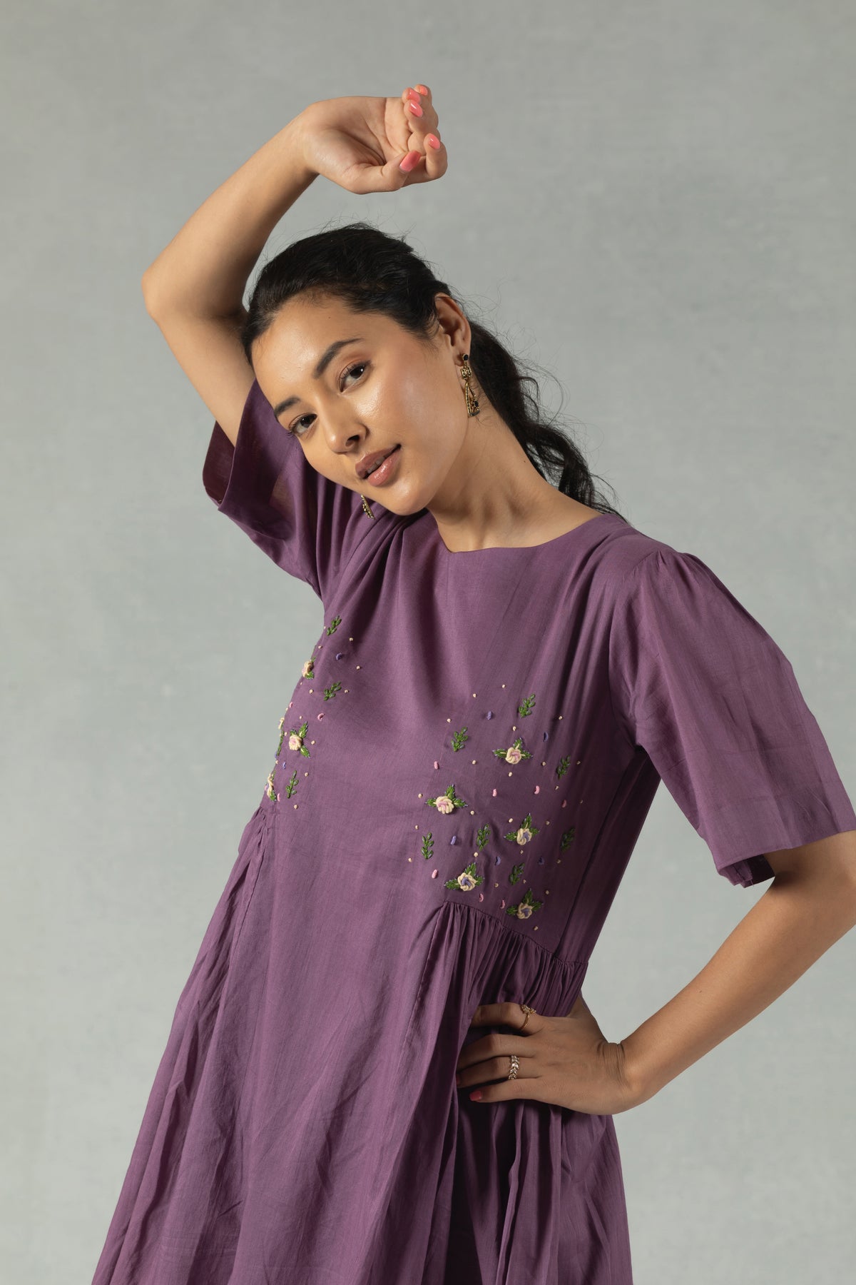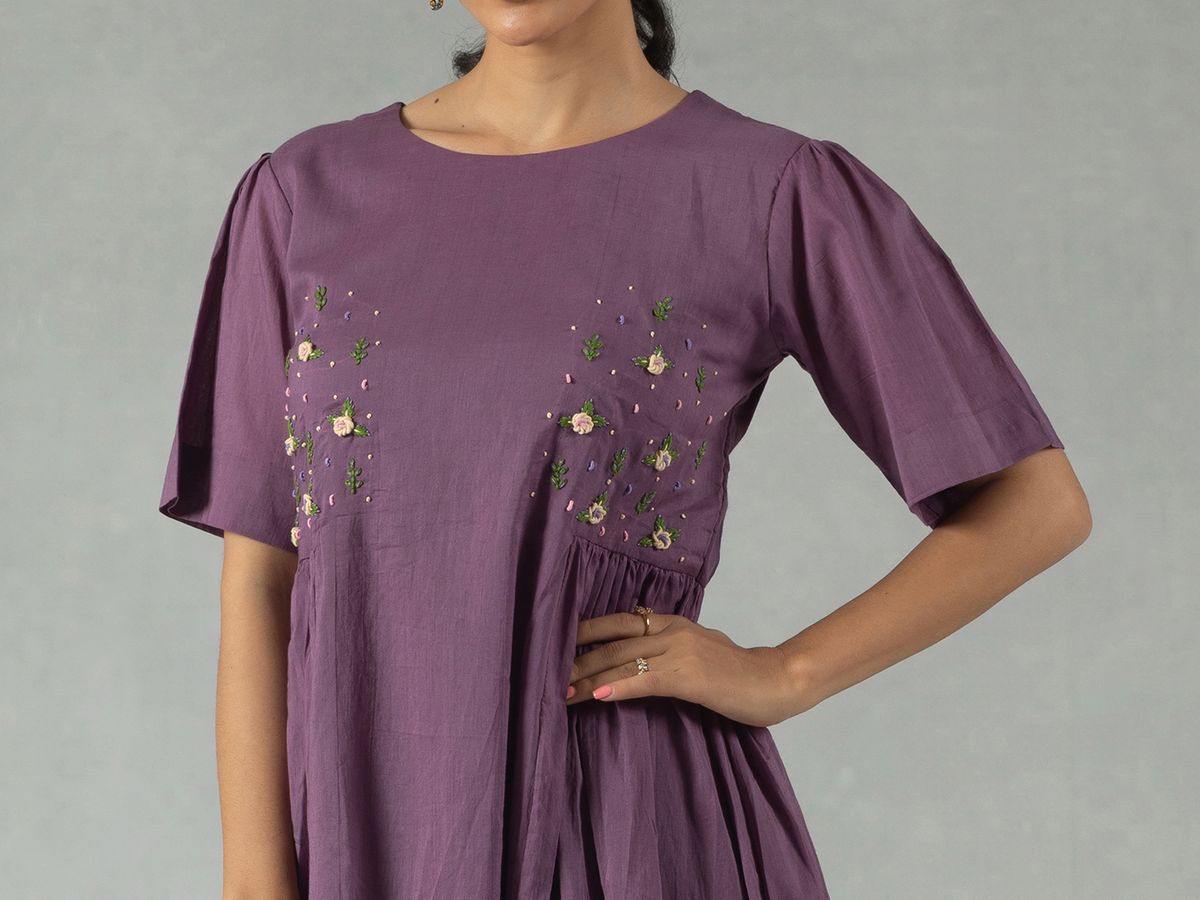 This plum purple dress balances comfort with quiet elegance. Featuring subtle hand embroidery, half sleeves and a round neckline, it's made for daily wear where ease meets style. Breathable 100% pure cotton keeps you cool through the day. Hand wash recommended.