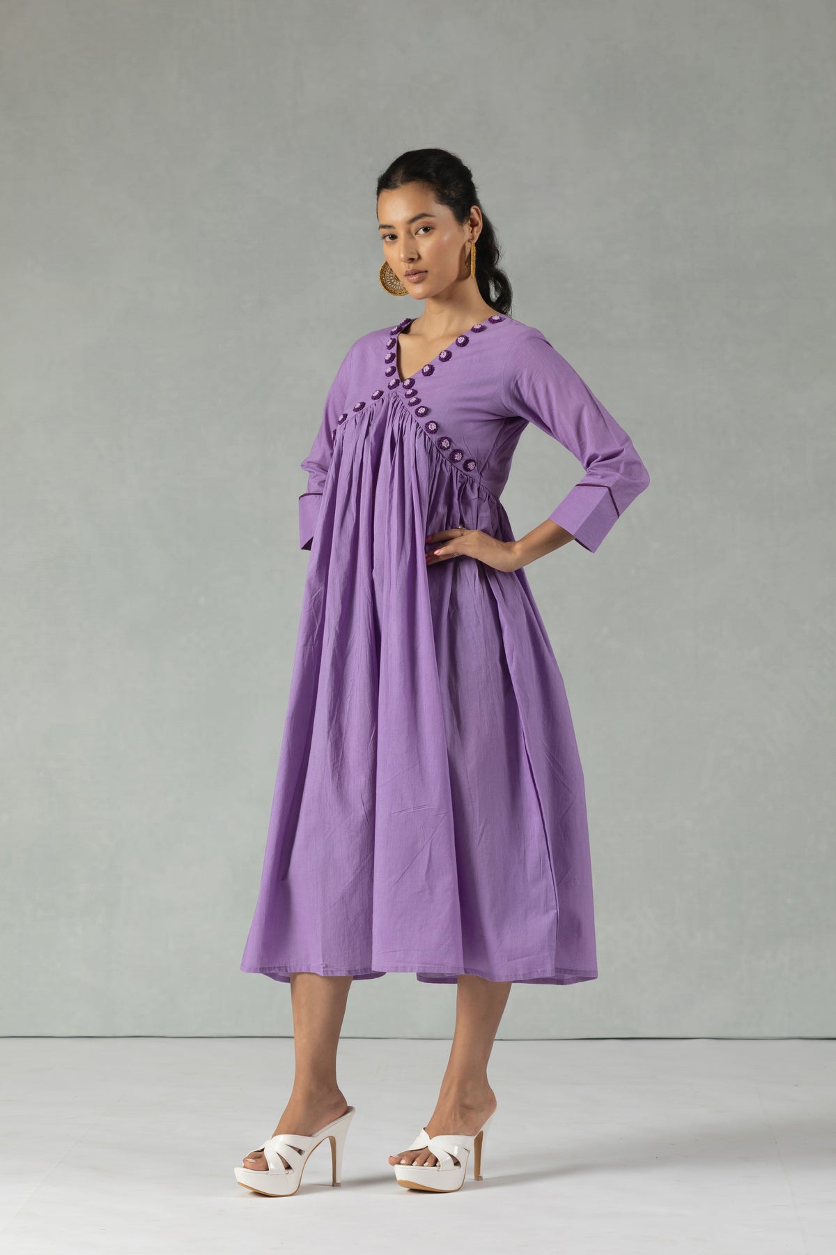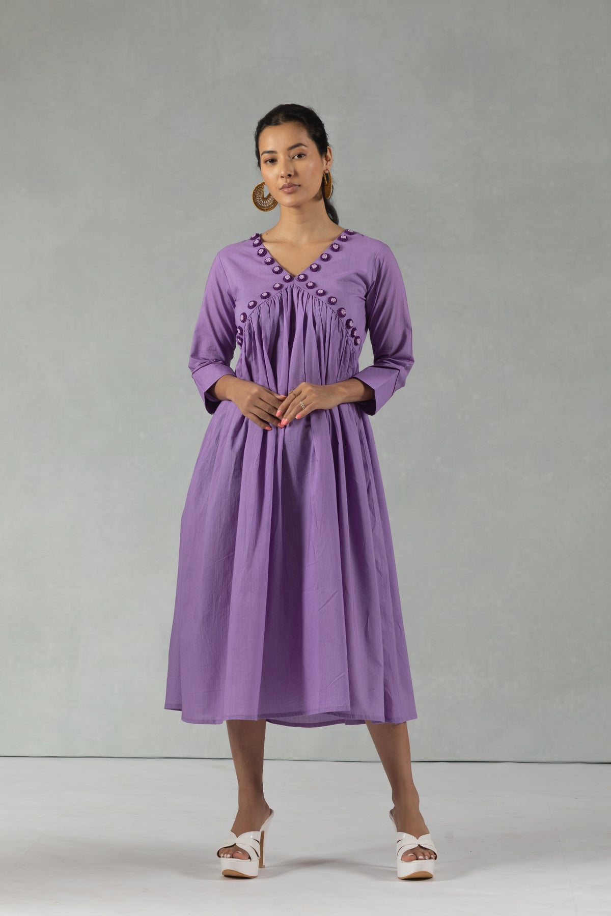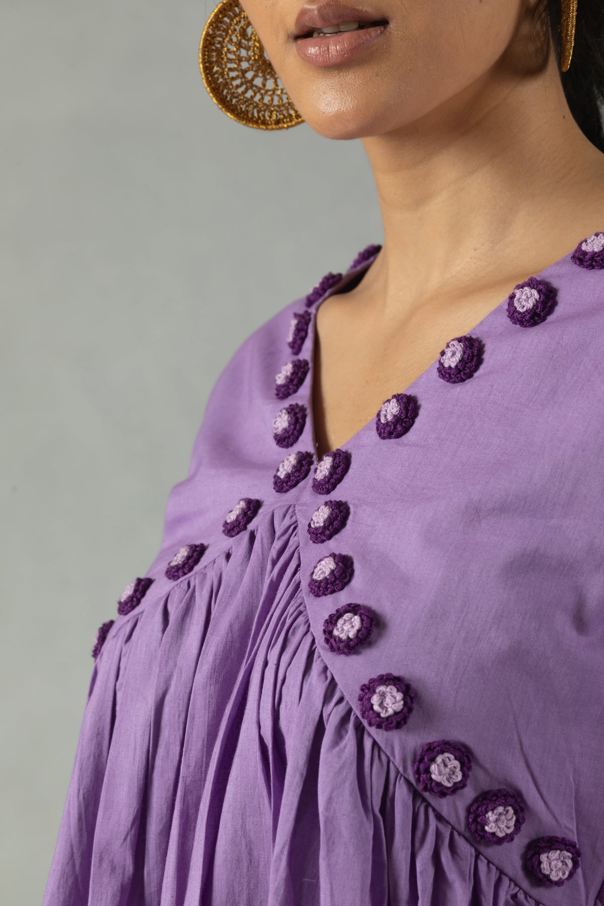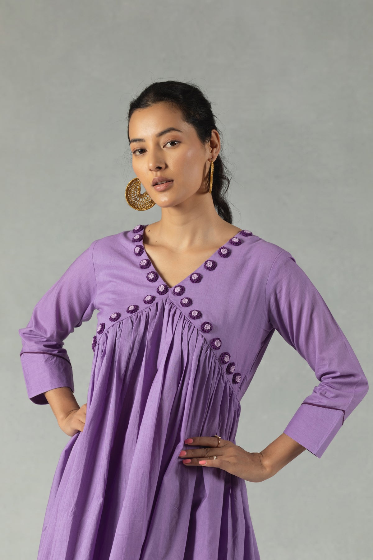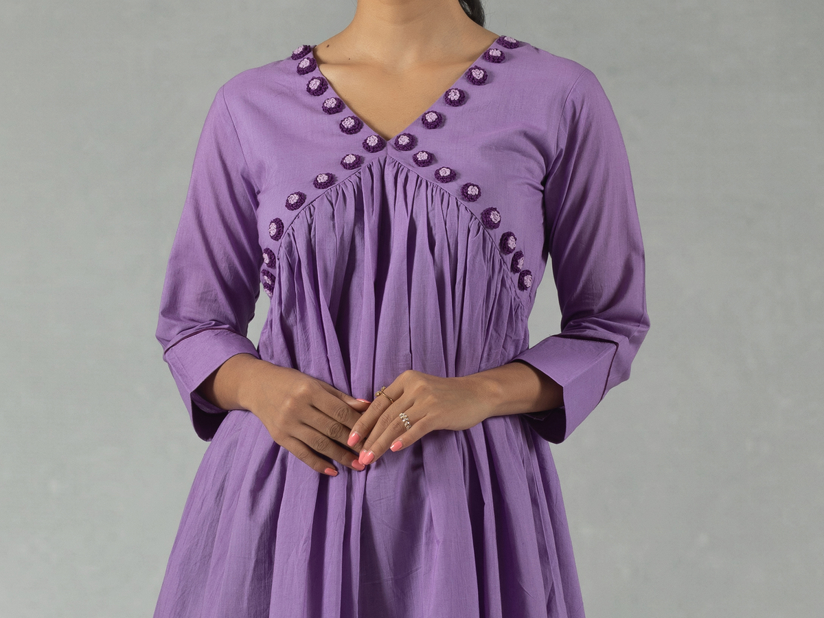 Soft purple tones pair with delicate hand embroidery to create this relaxed V-neck dress. Quarter sleeves and breathable 100% pure cotton offer comfort for casual brunches or light evenings out. Hand wash for lasting softness.