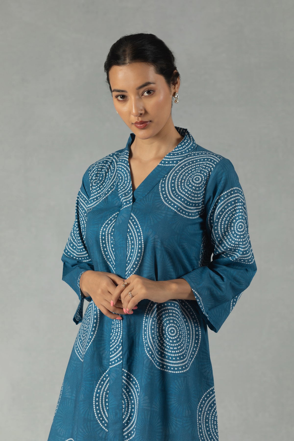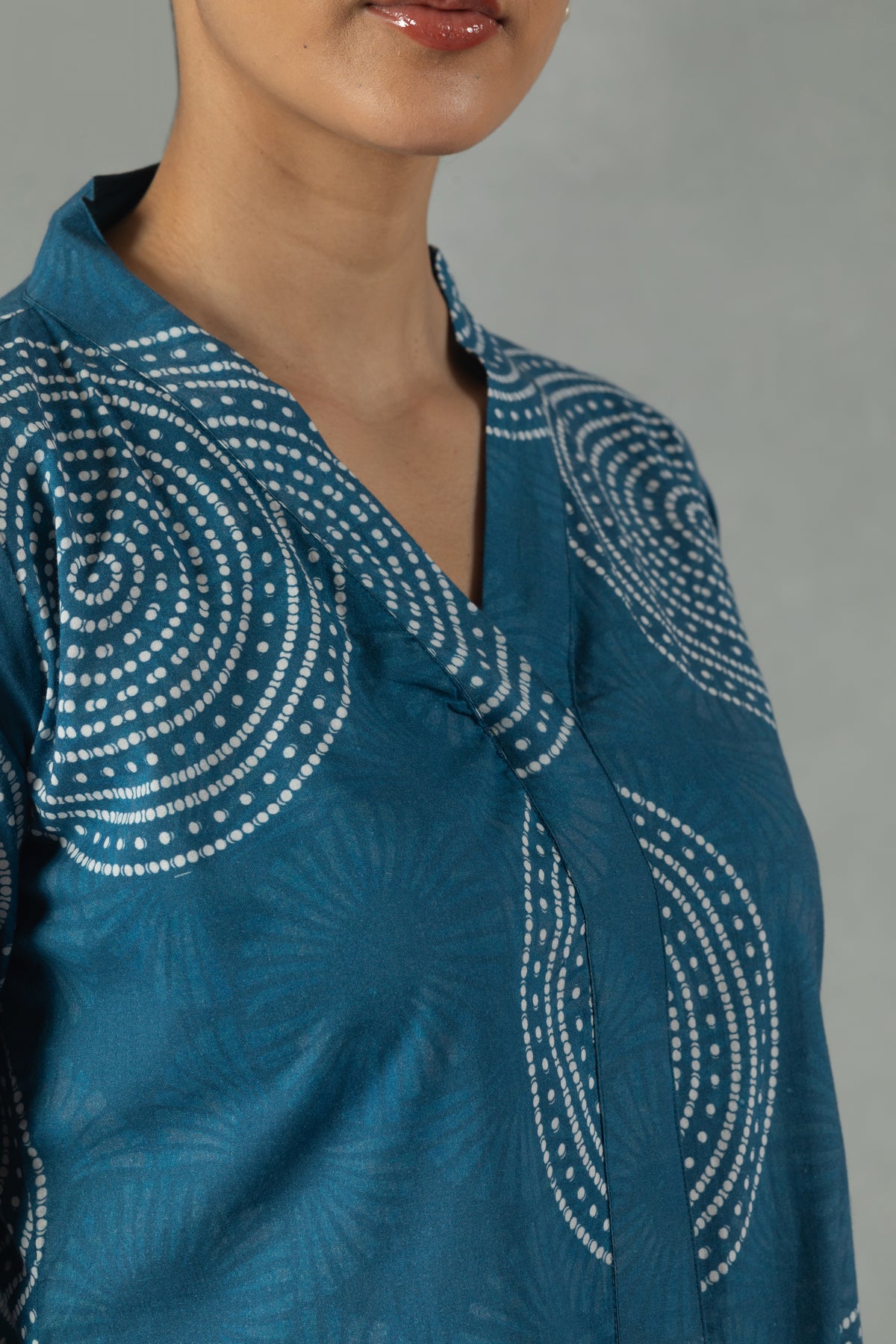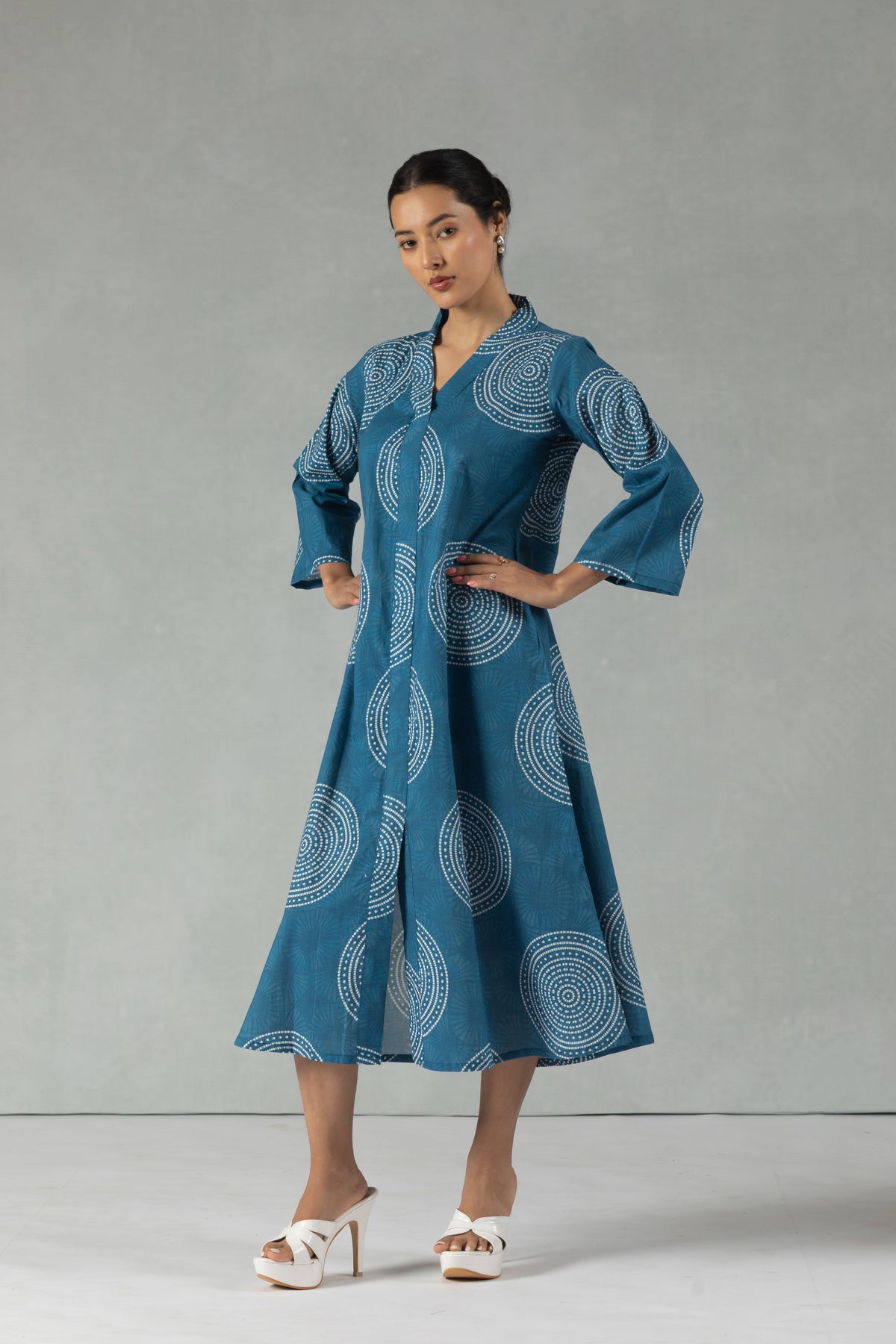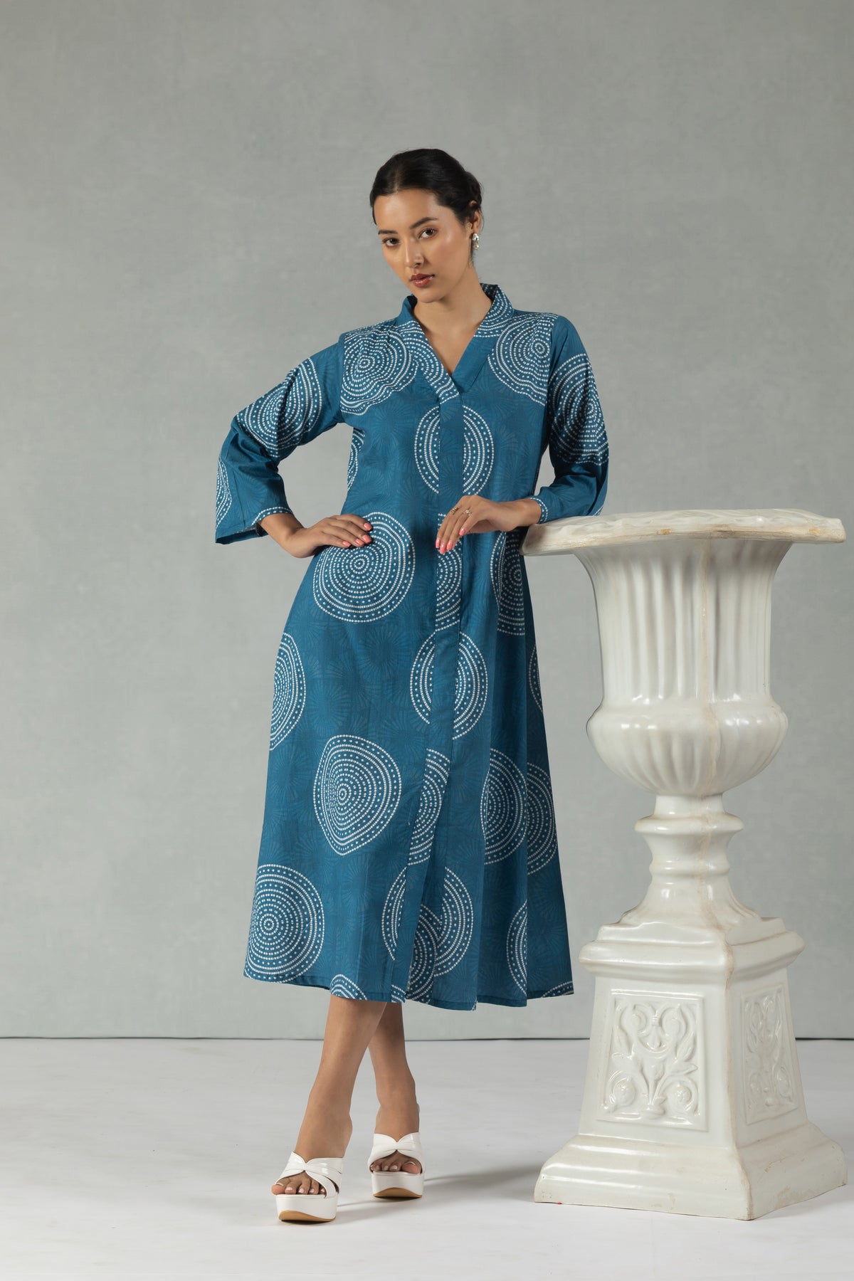 Clean geometric prints define this teal 100% pure cotton shift dress. The V-neckline and quarter sleeves offer effortless elegance, while the breathable fabric ensures comfort through long hours. Perfect for workdays or quick coffee meet-ups. Hand wash preferred.