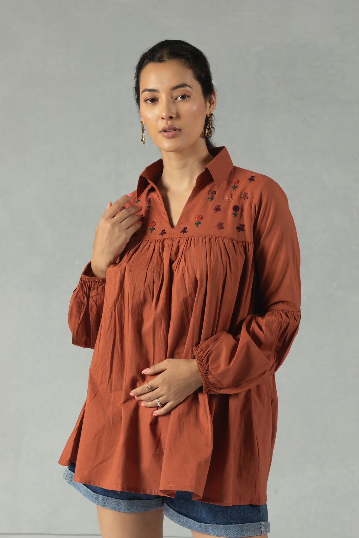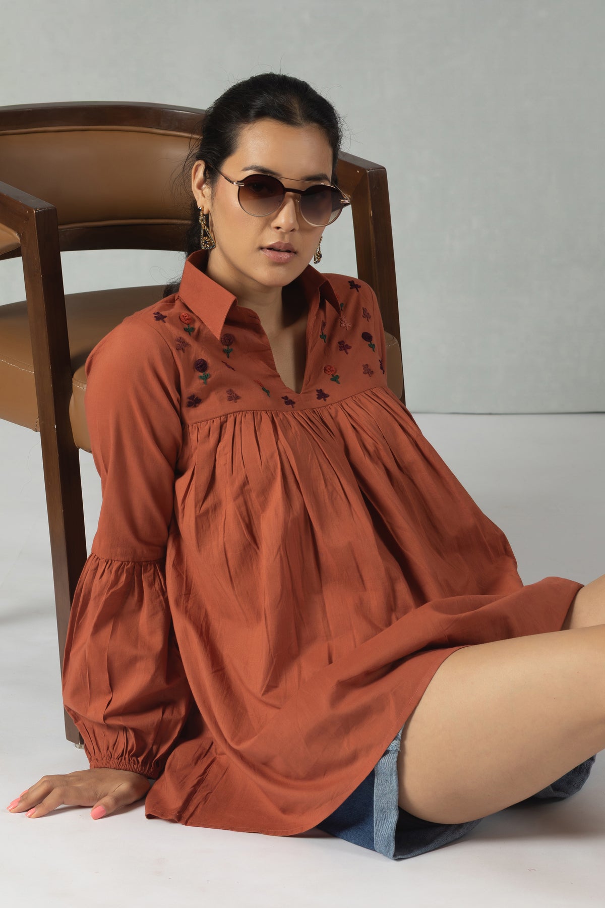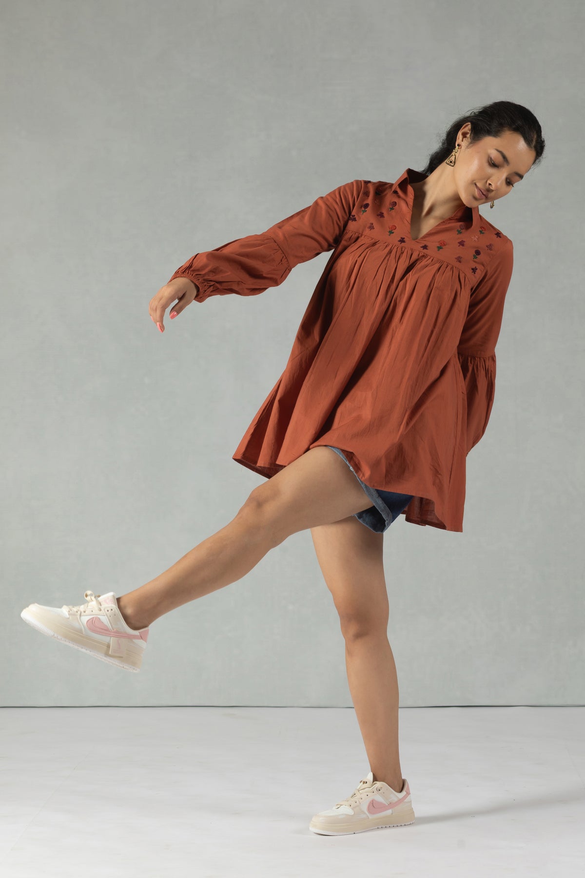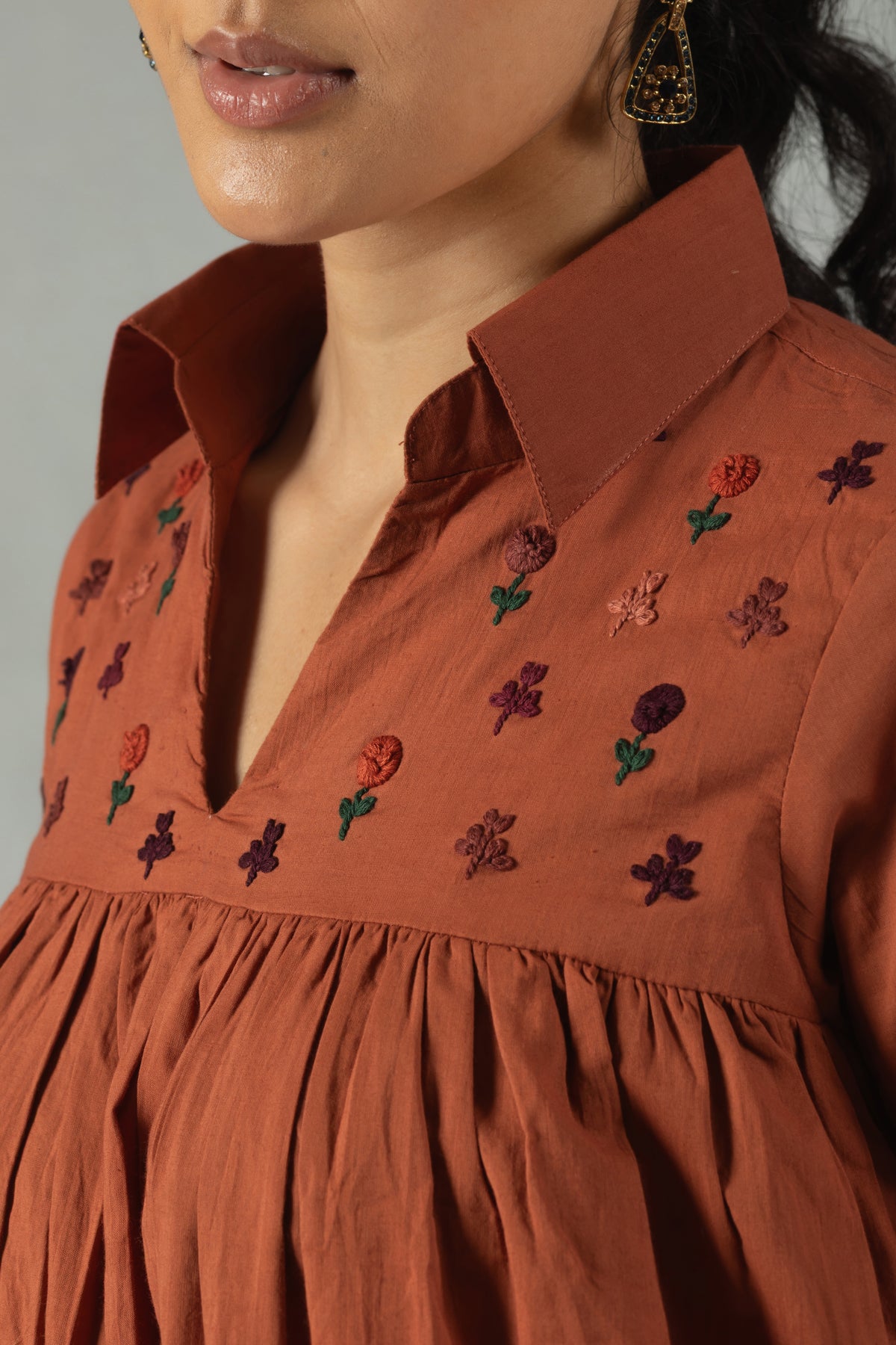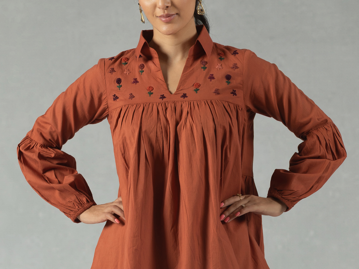 Earthy rust tones meet soft hand embroidery in this full-sleeve 100% pure cotton dress. With its easy fit and breathable fabric, it's your go-to choice for casual lunches or slow weekend mornings. Gentle hand wash keeps the fabric fresh.