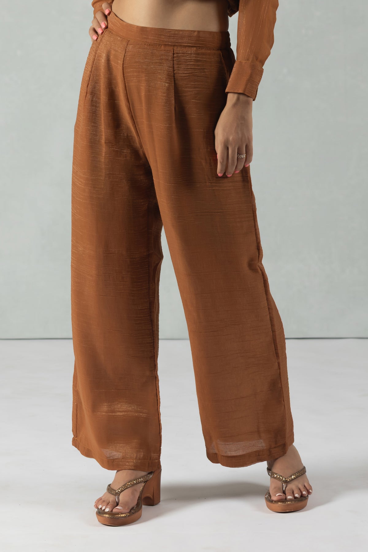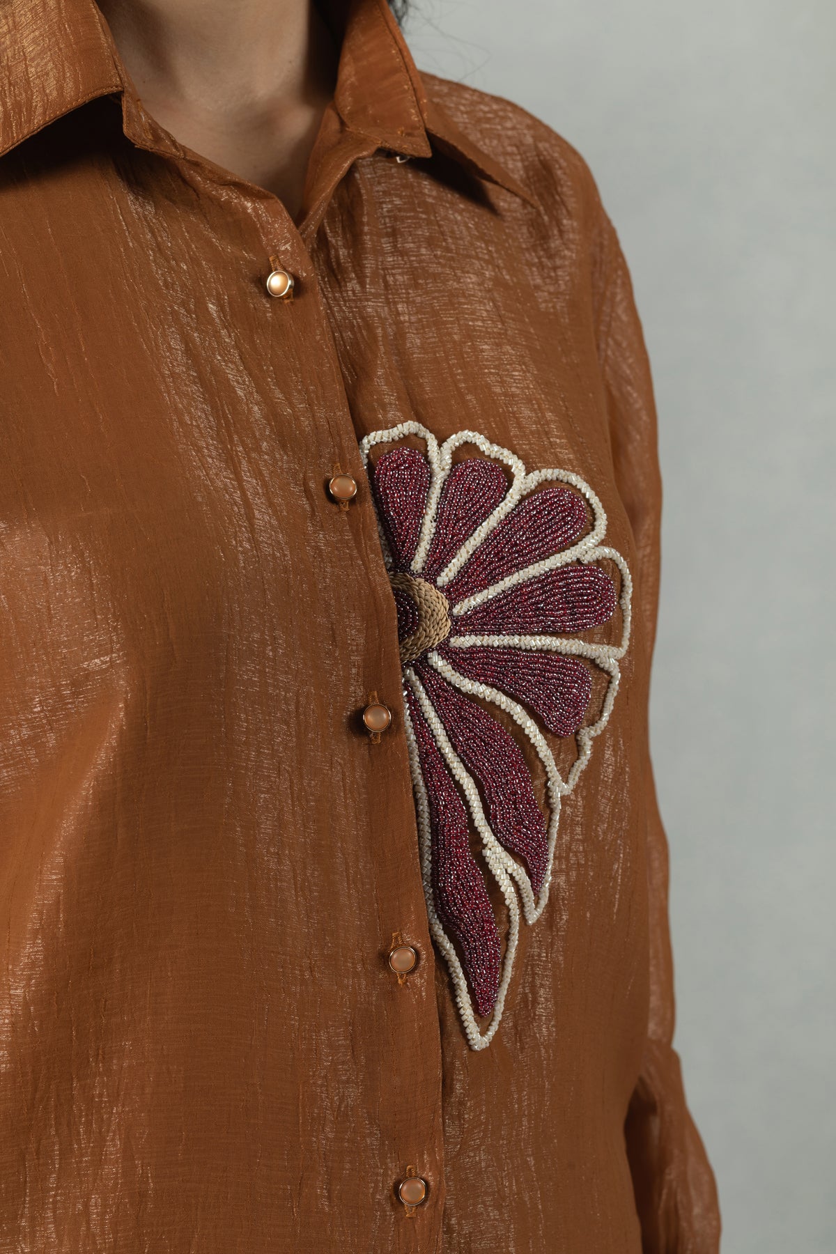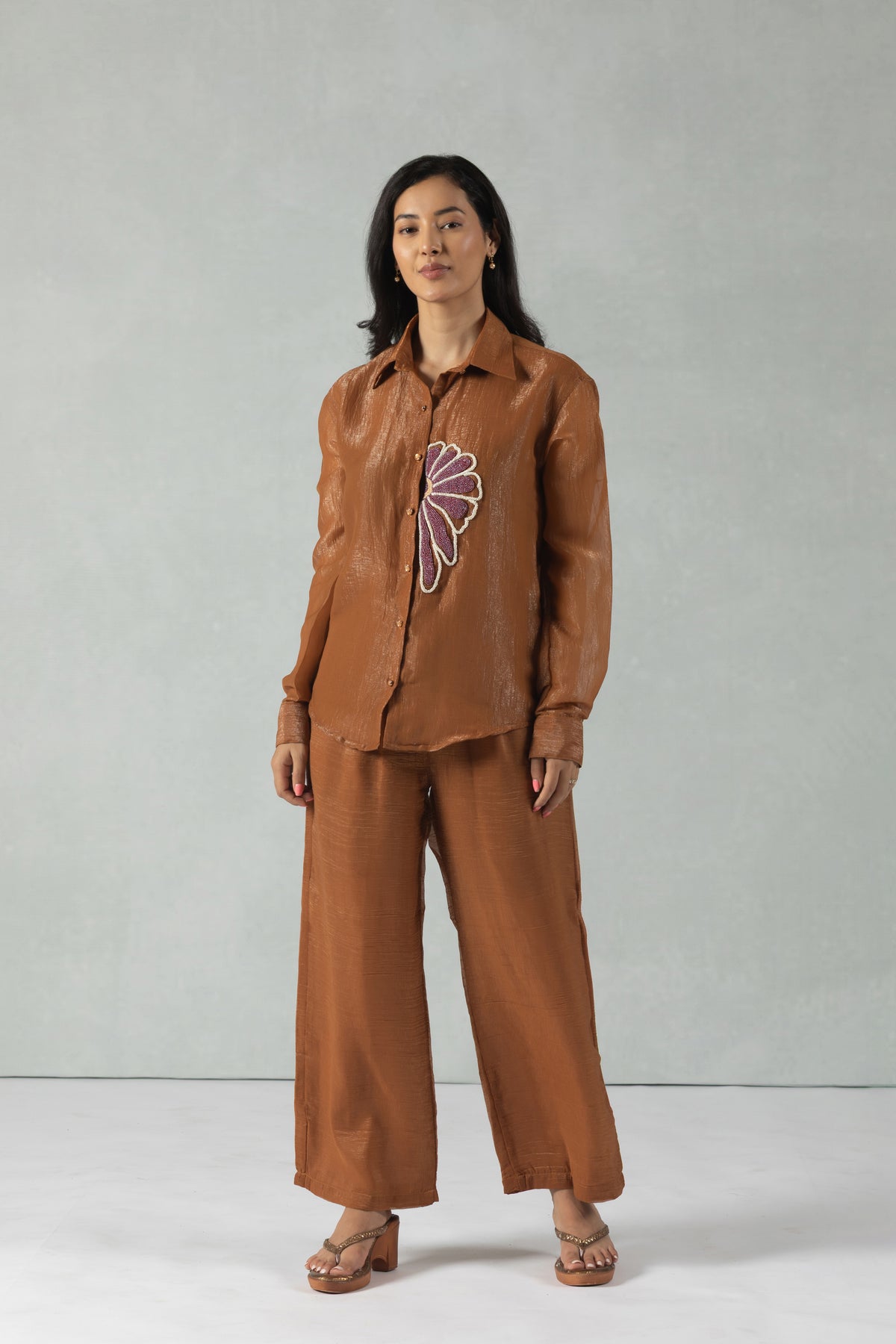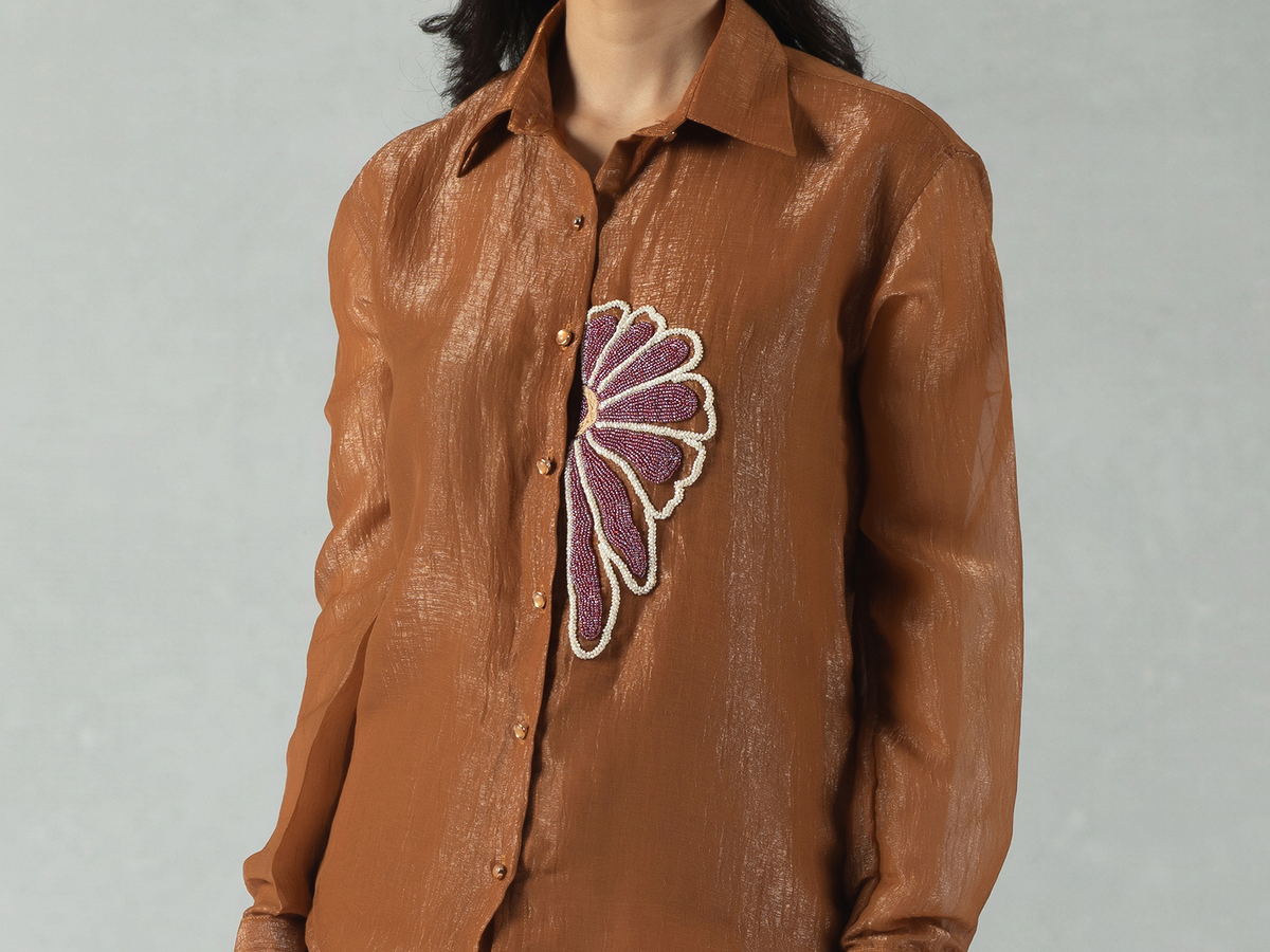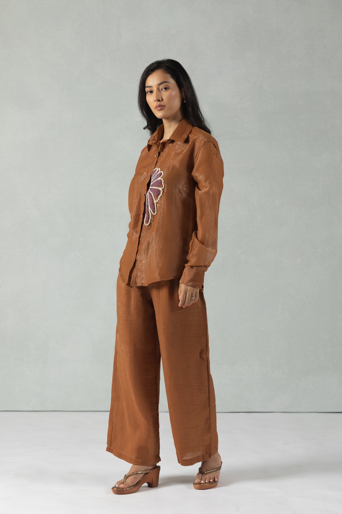 This playful brown 100% pure tissue crush co-ord set features intricate handwork embroidery that adds a touch of whimsy. Full sleeves and a relaxed fit keep it comfortable through day-long celebrations or gatherings. Hand wash to protect the hand embroidery.