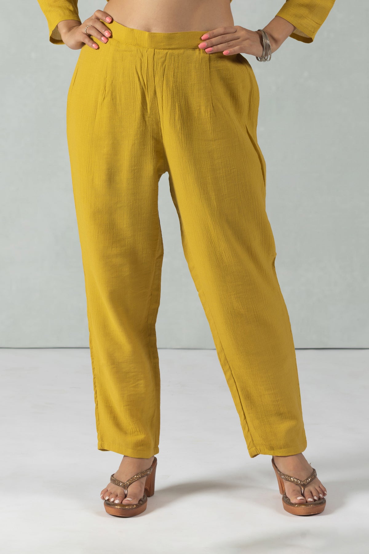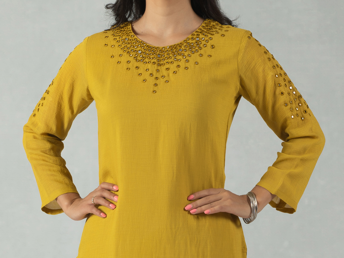 Bright marigold yellow paired with handwork embroidery defines this breathable 100% pure cotton co-ord set. The round neckline and quarter sleeves create a balanced look for festive lunches or casual gatherings. Hand wash recommended to preserve softness.