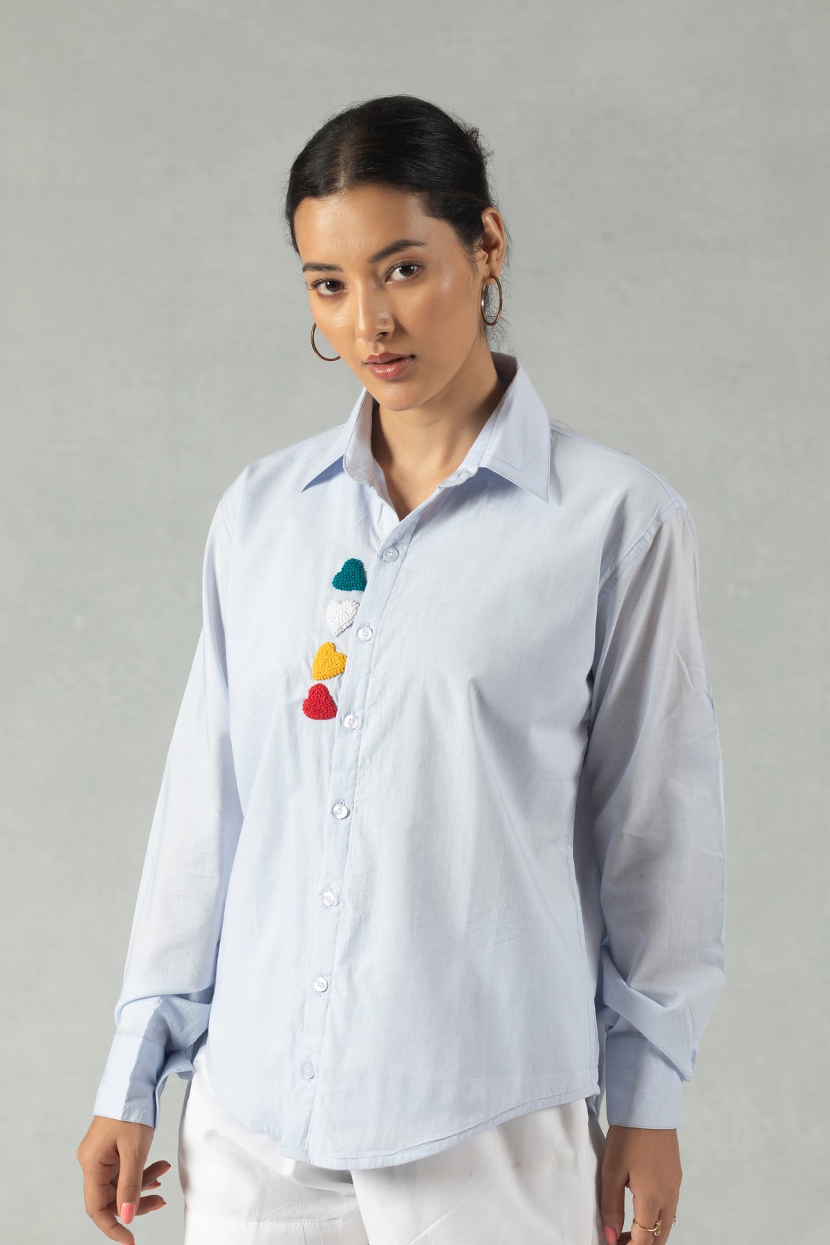 Blue Cotton Shirt with Bold Heart Embroidery